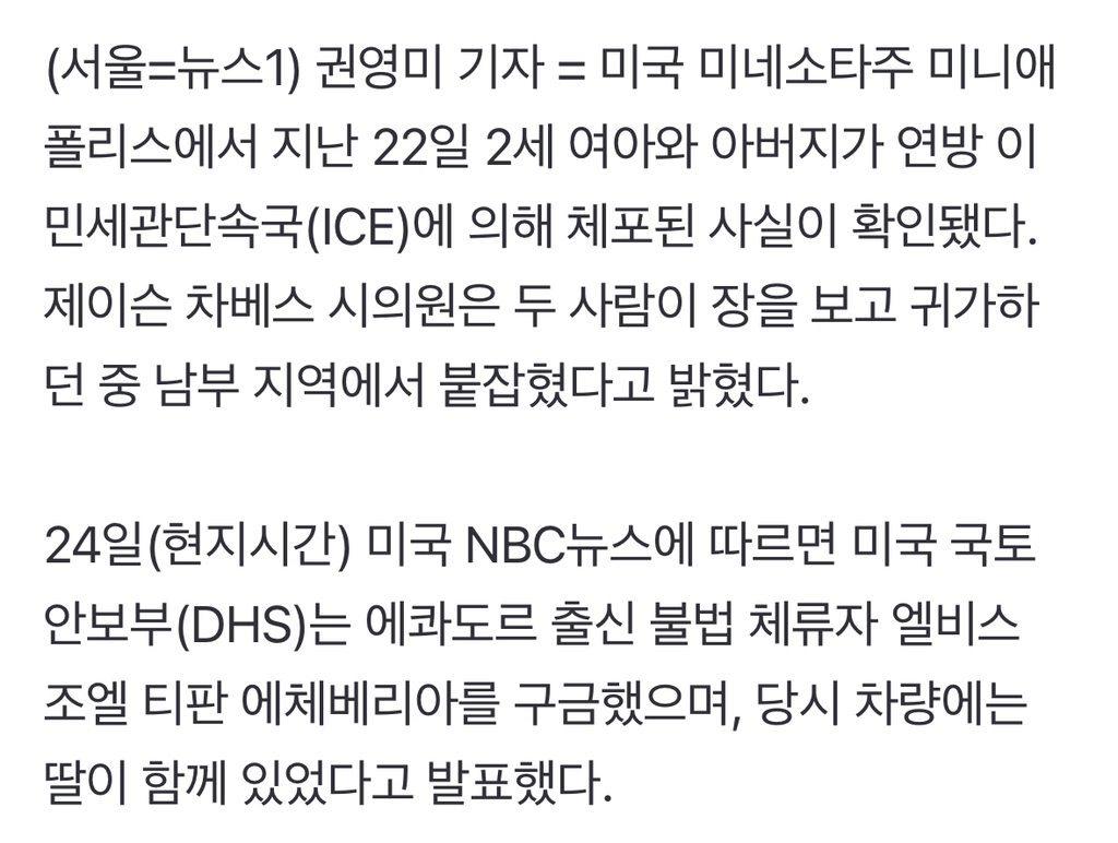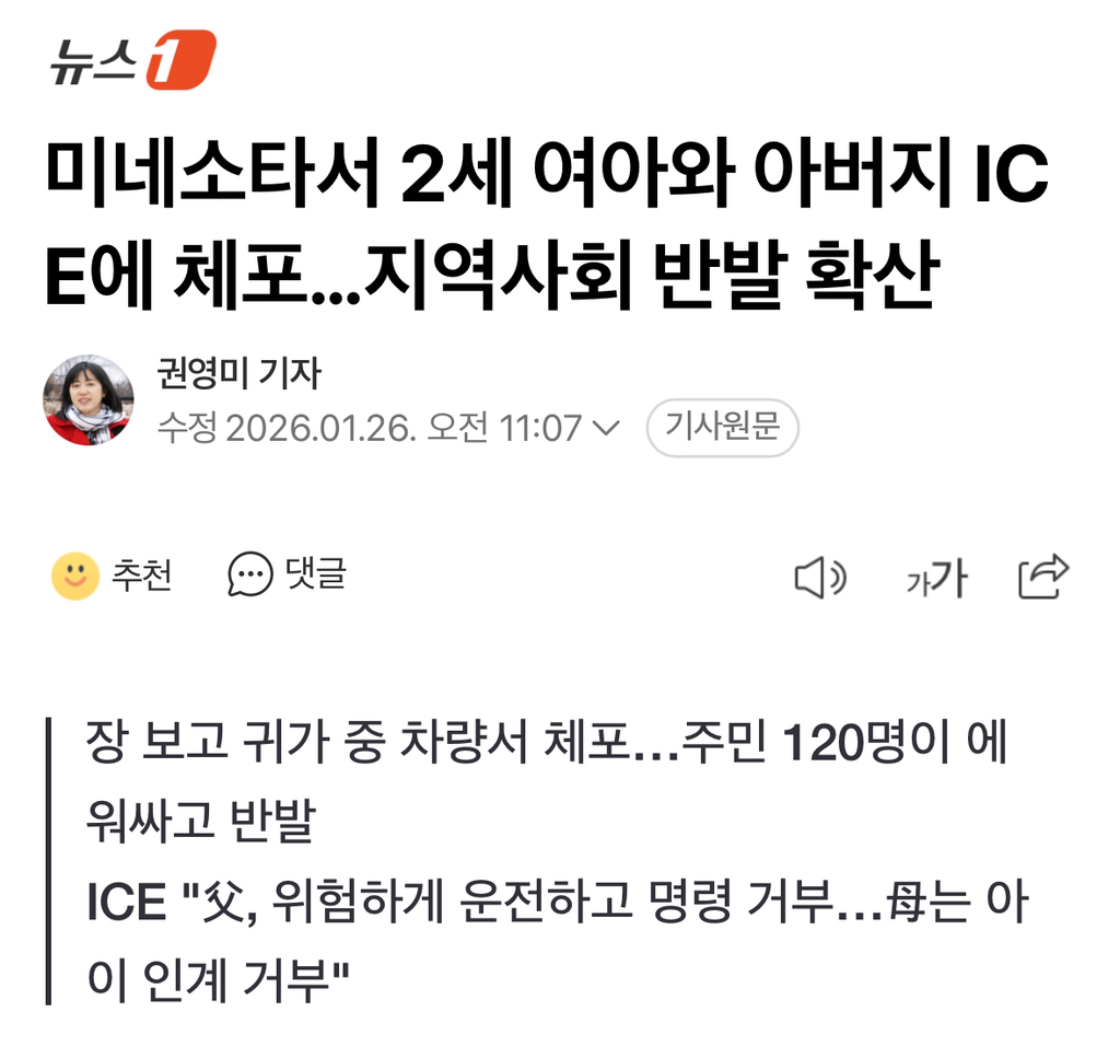 [여시뉴스데스크]미네소타서 2세 여아와 아버지 ICE에 체포…지역사회 반발 확산 작성자소리앙|작성시간26.01.26|조회수4,824 목록 댓글 2 글자크기 작게가 글자크기 크게가 출처: https://naver.me/G9paqaTF미네소타서 2세 여아와 아버지 ICE에 체포…지역사회 반발 확산미국 미네소타주 미니애폴리스에서 지난 22일 2세 여아와 아버지가 연방 이민세관단속국(ICE)에 의해 체포된 사실이 확인됐다. 제이슨 차베스 시의원은 두 사람이 장을 보고 귀가하던 중 남부 지n.news.naver.com전문출처 다음검색 현재 게시글 추가 기능 열기 북마크 공유하기 신고 센터로 신고 댓글 댓글 2 댓글쓰기 답글쓰기 댓글 리스트 작성자절대 둔촌주공을 검색하지마 | 작성시간 26.01.26 ㅅㅂ 아니 적당히 해야지 5살 애, 2살 애들까지 잡을 필요 있냐고 작성자새해에는미니멀 | 작성시간 26.01.27 미쳤음 진짜 댓글 전체보기