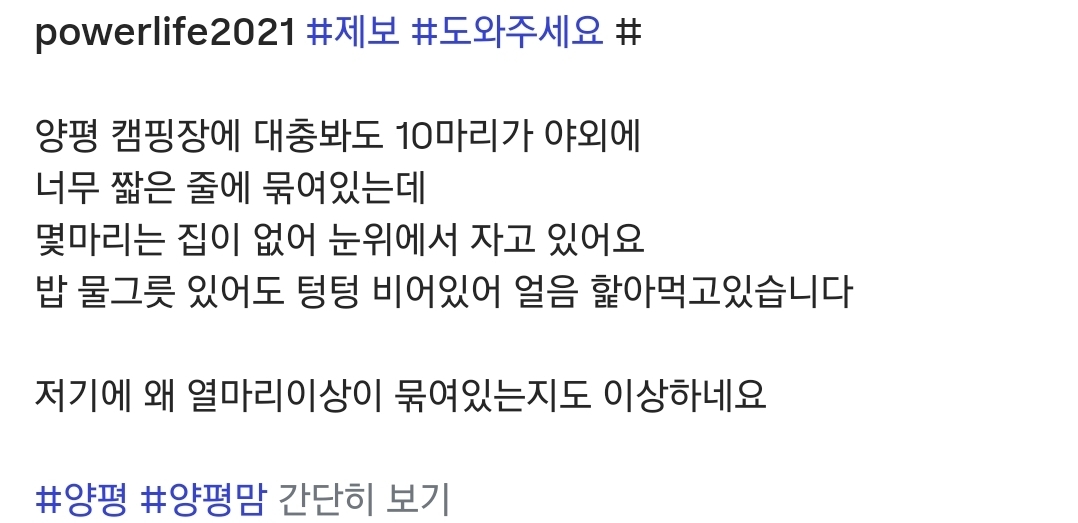 [칵.cxxx]양평 캠핑장에 집도 없이 파이프에 묶여있는 개들 작성자눈물이방울방울|작성시간26.01.26|조회수37,987 목록 댓글 48 글자크기 작게가 글자크기 크게가 출처: 여성시대 눈물이방울방울 https://www.instagram.com/p/DT7Phhdkesf/?뭐야시발 다음검색 현재 게시글 추가 기능 열기 북마크 공유하기 신고 센터로 신고 댓글 댓글 48 댓글쓰기 답글쓰기 댓글 리스트 작성자해피강와쥐 | 작성시간 26.01.26 어휴 ㅅㅂ 할수있는게 욕밖에없으니까 후원이라도해야겠다 작성자감자탕탕이 | 작성시간 26.01.26 ㅅㅂ 작성자몬쥐알쥐꽁 | 작성시간 26.01.26 아 존나열받네 시발 니가 저렇게 살아봐 작성자펫샵은그냥끄지세요 | 작성시간 26.01.26 하 ㅅㅂ 제발 좀 작성자생각하고다시말해 | 작성시간 26.01.26 인간새끼야 너도 저러고 살아라 댓글 전체보기