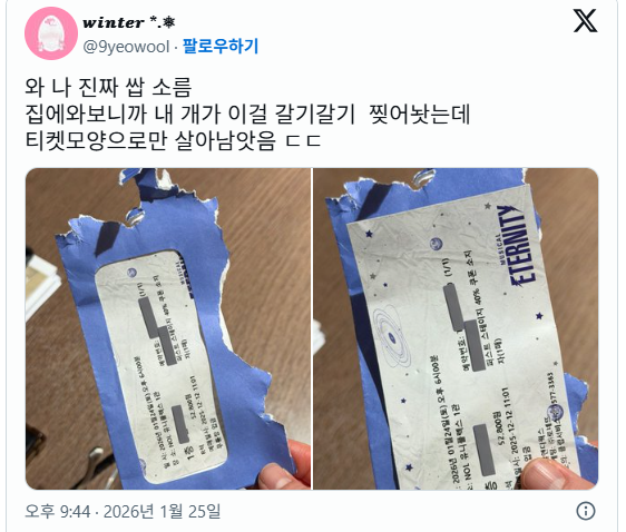 [흥미돋]강아지가 티켓봉투 물어뜯어놓음 작성자Car페인중독|작성시간26.01.26|조회수57,097 목록 댓글 24 글자크기 작게가 글자크기 크게가 출처: ↓https://x.com/9yeowool/status/2015405449345118523?s=20 다음검색 현재 게시글 추가 기능 열기 북마크 공유하기 신고 센터로 신고 댓글 댓글 24 댓글쓰기 답글쓰기 댓글 리스트 작성자꼬슴도치의 품격 | 작성시간 26.01.26 효견ㄷ ㄷ ㄷ 작성자데이사라 | 작성시간 26.01.26 보기 편하라고 미리 뜯어준 거네 작성자점심맛있다 | 작성시간 26.01.26 식감?이 안좋았던걸까 ㅋㅋㅋㅋ 작성자않됀다 | 작성시간 26.01.26 강아디에디션 ㄷㄷㄷ 작성자투명에 가까운 블루 | 작성시간 26.01.26 뜯기 힘들까봐... 개봉서비스... 효견 댓글 전체보기