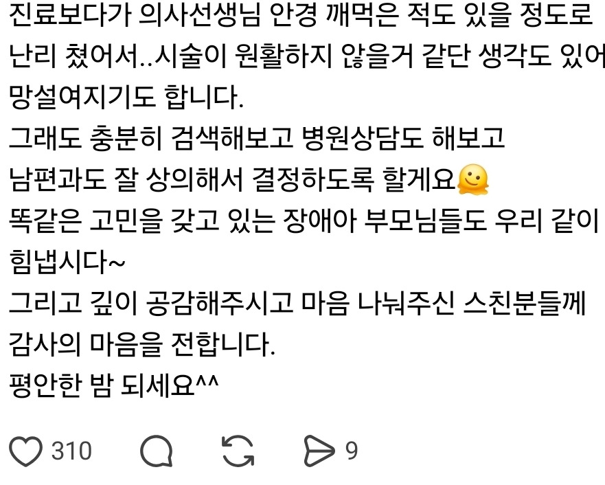 [흥미돋]초경도 안한 딸의 피임 수술을 고민하는 부모의 글 작성자ㅅi작|작성시간26.01.26|조회수40,399 목록 댓글 187 글자크기 작게가 글자크기 크게가 출처: https://theqoo.net/square/4074380714지적장애가 있는 아이인가봐..ㅠㅠ 다음검색 현재 게시글 추가 기능 열기 북마크 공유하기 신고 센터로 신고 댓글 댓글 187 댓글쓰기 답글쓰기 댓글 리스트 작성자비락 | 작성시간 26.01.27 아 처음엔 엥 싶엏는데 카테고리?가 자폐아동이었네ㅠㅠ 고민할만해... 작성자트벅트벅 | 작성시간 26.01.27 아 지적장애가 있어서..하 ㅠㅠㅠㅠㅠㅠㅠㅠㅠㅠㅠㅠ 쉬발 ㅠㅠㅠㅠ 고민할만하다 진짜 작성자강고양이 | 작성시간 26.01.27 아 지적장애...ㅠㅠ 맘 아파 작성자bitter melon | 작성시간 26.01.27 글쓴님 마음이 너무 이해가서 슬프다 ㅠㅠㅠㅠㅠ 작성자평화동전쟁군주 | 작성시간 26.01.27 아...... 댓글 전체보기