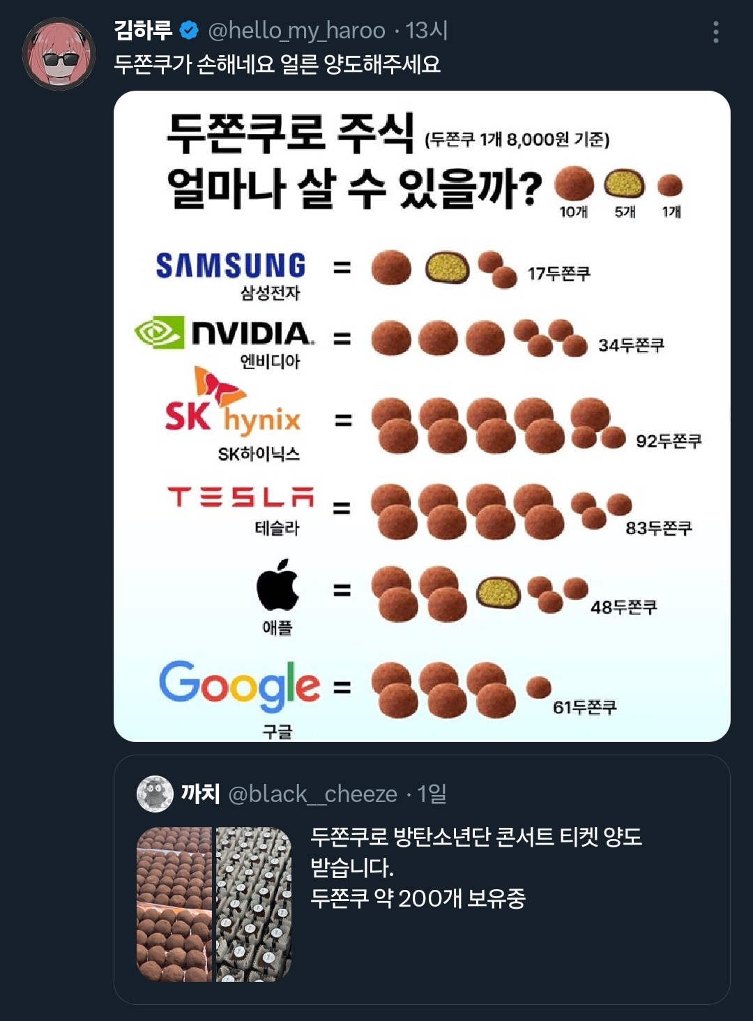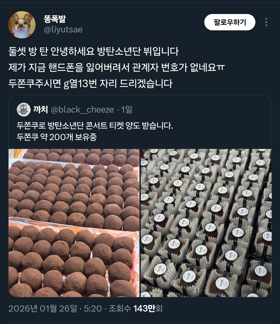 [흥미돋]두쫀쿠 200개로 방탄소년단 콘서트 티켓 구하는 중인 팬 작성자성규특별시|작성시간26.01.27|조회수64,298 목록 댓글 18 글자크기 작게가 글자크기 크게가 출처: 여성시대 성규특별시https://x.com/i/status/2015385627198640145https://x.com/i/status/2015520196824633703https://x.com/i/status/2015604867516219446https://x.com/i/status/2015635208985571470 다음검색 현재 게시글 추가 기능 열기 북마크 공유하기 신고 센터로 신고 댓글 댓글 18 댓글쓰기 답글쓰기 댓글 리스트 작성자홈런볼런홈 | 작성시간 26.01.27 걍 홍보하려고 쓴 거 아냐? 작성자민트초코초코코 | 작성시간 26.01.27 걍 농담이겟지ㅋㅋㅋ 작성자diamondskys | 작성시간 26.01.27 물물교환인데 안되나?ㅋㅋㅋ 작성자Fix you | 작성시간 26.01.27 티켓값 줄텐데 저건 무나 개념으로 드려요 하면 가능하지 ㅋㅋㅋ 작성자과정을 질투하라 | 작성시간 26.01.27 공장 같아ㅋㅋㅋ 댓글 전체보기