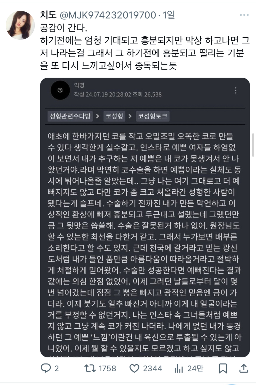 작성자구월사아일 작성시간 26.01.27 욕심이 커서그래..컴플렉스를 없애거나 완화한다, 정도로만 생각하면 돼..근데 그걸 위해 성형까지 감행할거냐? 그건 아니다는거지..지금 얼굴에 만족못하면 끝이 없어 그렇게 뷰티랑 성형산업 돈 계속 불려주고 같은 외모정병 더더 확산되고..