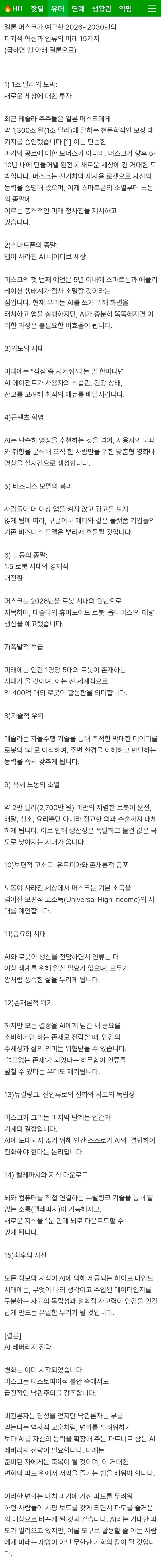 [스크랩] [흥미돋]일론 머스크의 대AI 로봇시대 15가지 예측 작성자뭔쌉소리세요|작성시간26.01.27|조회수9,742 목록 댓글 49 글자크기 작게가 글자크기 크게가 내 잔고를 고려해서 알아서 음식세팅을 해준다고? 이런씹 다음검색 스크랩 원문 : 도탁스 (DOTAX) 현재 게시글 추가 기능 열기 북마크 공유하기 신고 센터로 신고 댓글 댓글 49 댓글쓰기 답글쓰기 댓글 리스트 작성자바이얼리 | 작성시간 26.01.27 1년만에 남녀노소 챗지피티 쓰는데 못될게뭐여 작성자냥쫀쿠 | 작성시간 26.01.27 미래 무섭다.. 작성자구름스테이크 | 작성시간 26.01.27 살아남는 직업은 뭘까 작성자정관장모닝 | 작성시간 26.01.28 흠 작성자종합비타민하루2알 | 작성시간 26.01.29 영화 월이에서 우주선에 있는 인간들 댓글 전체보기