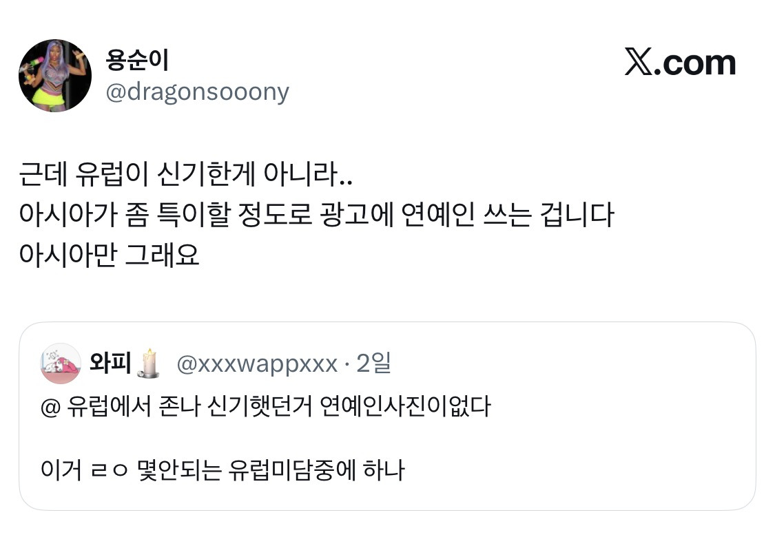 작성자도리렁 작성시간 26.01.27 연옌 써서 잘된 케이스가 분명 있어서 (동서식품, 젠틀몬, bhc, 처음처럼) 계속 쓰는 것 같은데 진심 무지성으로 쓰는 건 너무 이해 안감.. 난 특히 저가커피에서 손이나 아이돌 쓰는거ㅋㅋㅋㅋㅋ누가 연옌 보고 사먹지 싶음
