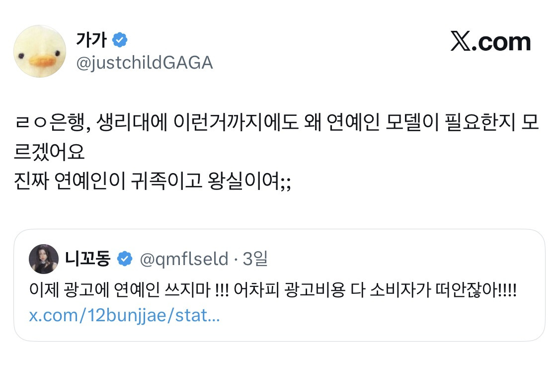 작성자잘될겨 작성시간 26.01.27 난 진짜 어렸을 때부터 이상했어 왜 그걸 전국민이 다 떠안음? 유명인이 광고한다고 잉부러 사 본적 한번도 없음;; 물건이랑 서비스랑 뭔상관이야