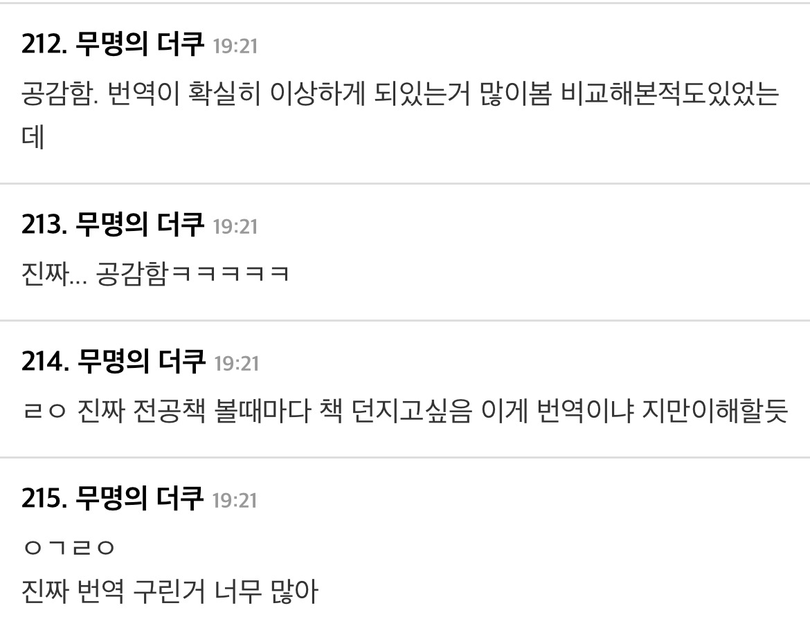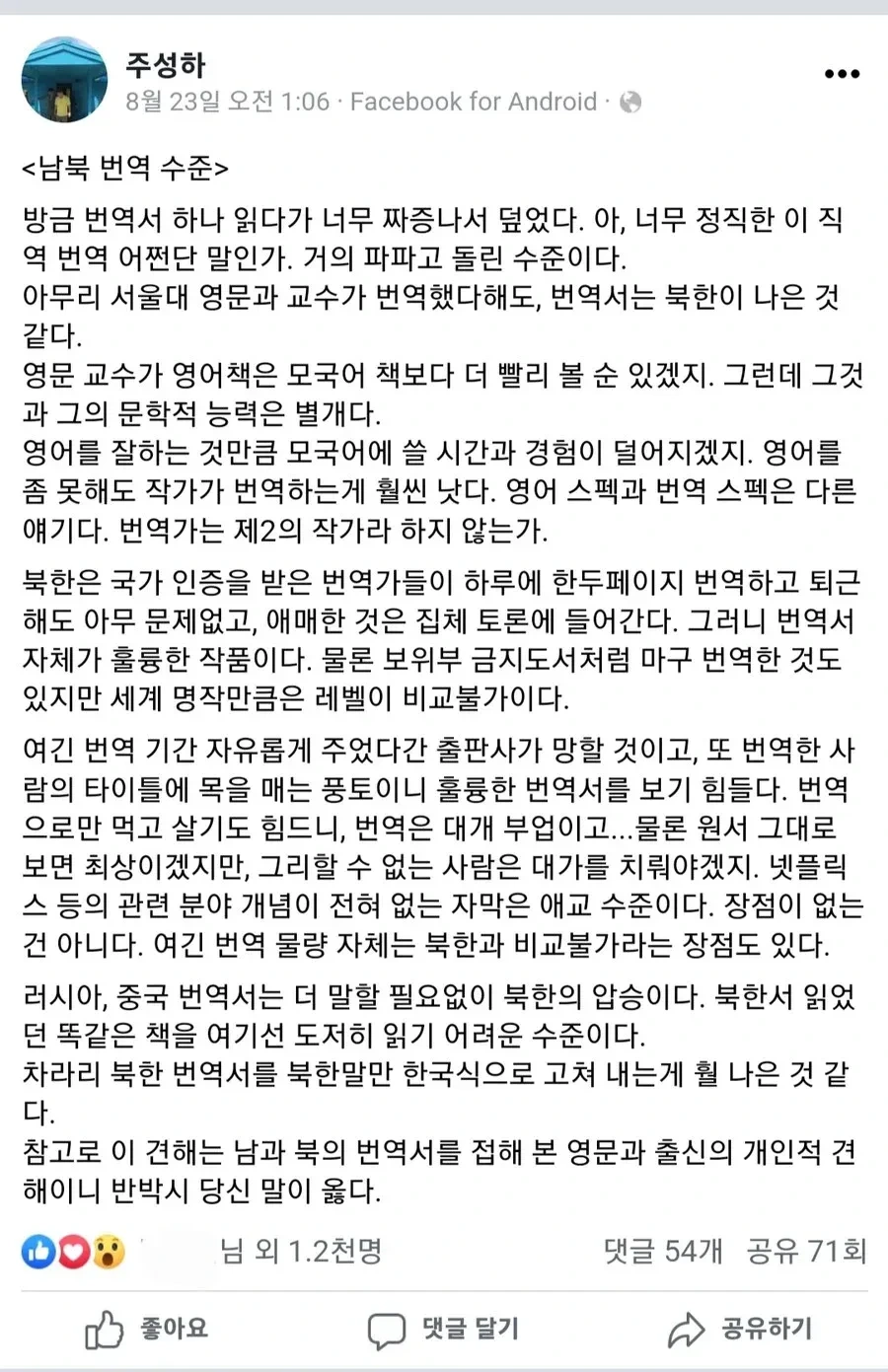 [스크랩] [흥미돋]탈북민 출신 기자 "남한은 번역 수준이 낮다" 작성자북한|작성시간26.01.27|조회수12,869 목록 댓글 26 글자크기 작게가 글자크기 크게가 출처: https://theqoo.net/square/3329174600 공감추 다음검색 스크랩 원문 : *여성시대* 차분한 20대들의 알흠다운 공간 현재 게시글 추가 기능 열기 북마크 공유하기 신고 센터로 신고 댓글 댓글 26 댓글쓰기 답글쓰기 댓글 리스트 작성자oh okay | 작성시간 26.01.27 솔직히 맞말. 차라리 원서가 이해되더라 작성자천년의노래 | 작성시간 26.01.27 ㄹㅇ번역 너무 구려 그냥 번역기 돌린거 같음 작성자여자는 배짱으로 산다 | 작성시간 26.01.27 번역 단가 보면 다들 이해할걸^^ 작성자Jetaimefort | 작성시간 26.01.27 나도 그래서 통번역대학원 한국에서 안다님 ㅠ 솔직히 말하면 대학 학부때도 뭘 가르치는지 이해가 안됐음..ㅠ 작성자꼴갑떠는시트러스계열 | 작성시간 26.01.27 맞잖아.. 댓글 전체보기