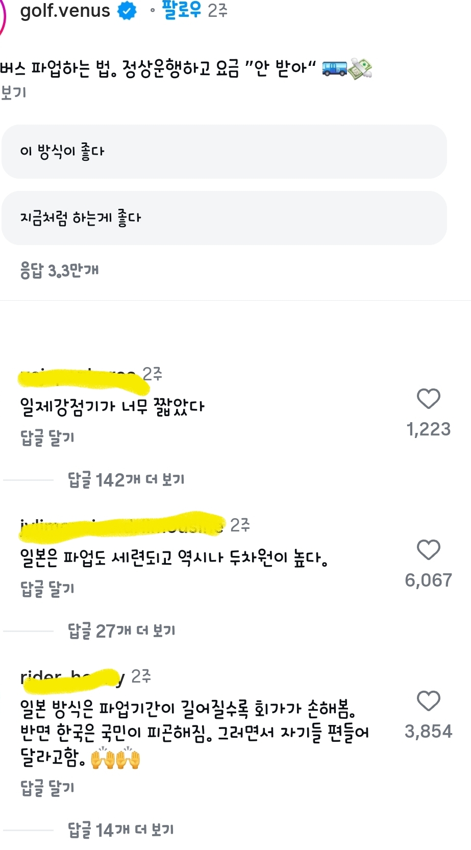 [기타]일본이 버스 파업하는 방법 게시글 베플.jpg 작성자퇴사하고싶고그런상태|작성시간26.01.27|조회수51,918 목록 댓글 179 글자크기 작게가 글자크기 크게가 출처: 여성시대 퇴사하고싶고그런상태 다음검색 현재 게시글 추가 기능 열기 북마크 공유하기 신고 센터로 신고 댓글 댓글 179 댓글쓰기 답글쓰기 댓글 리스트 작성자맛점 | 작성시간 26.01.28 저것들 왜놈이 하던거처럼 고문시켜봐야됨 작성자코재튼 | 작성시간 26.01.28 와… 첫 댓글 보고 너무 놀랬다 작성자바밤바가세상에서젤루좋아 | 작성시간 26.01.29 일제강점기때로 시간 여행 하셔서 제발 고문 받다가 뒤지길ㅠㅠ 작성자히히다리다다 | 작성시간 26.01.29 일제강점기 저 댓 뭐야…충격먹음 작성자아비가마니오네 | 작성시간 26.01.30 외 미친거같다 댓글 전체보기