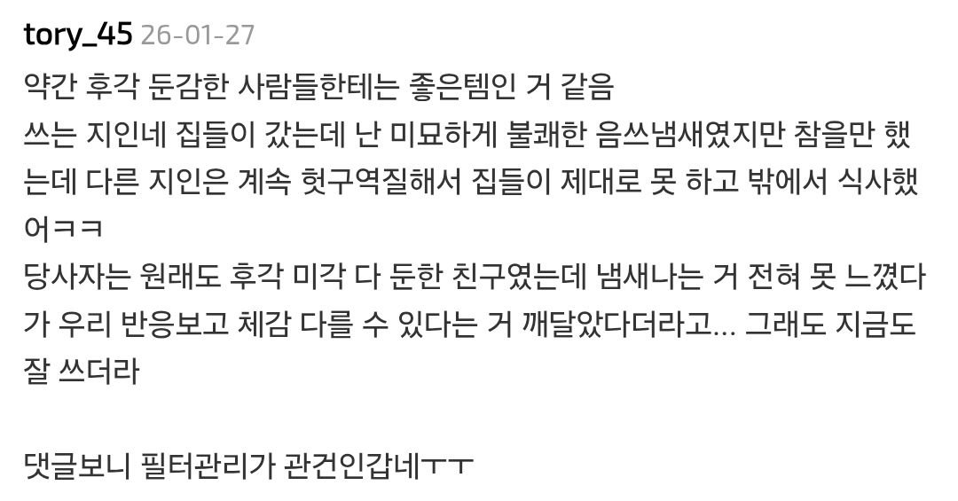 작성자초능력자 작성시간 26.01.29 집들이갔다가 써보고싶던거라 봤는데 다용도실 문열자마자 냄새너무나서 놀램...