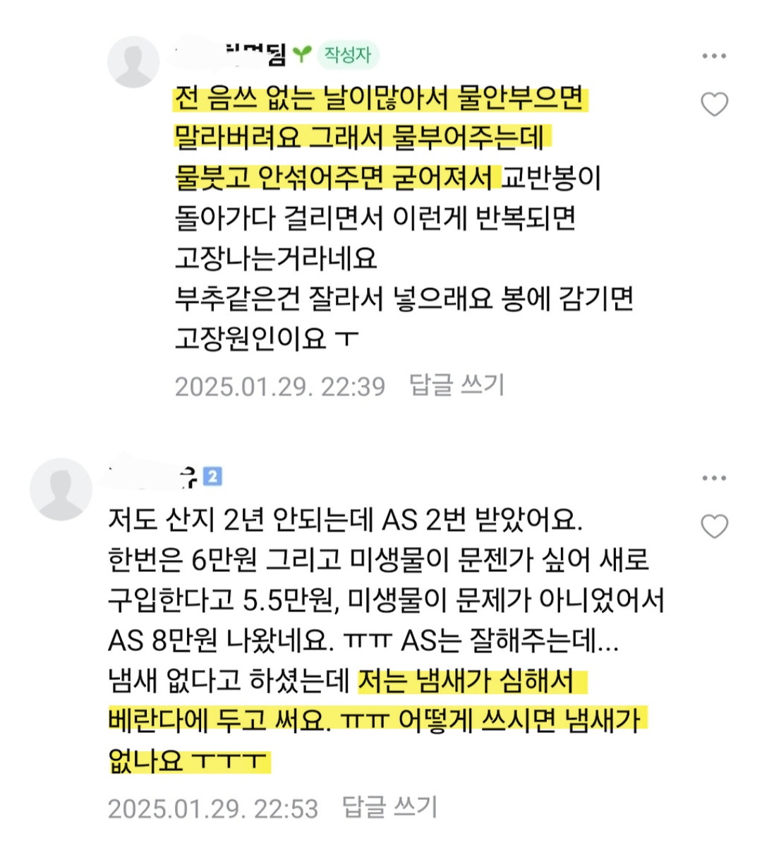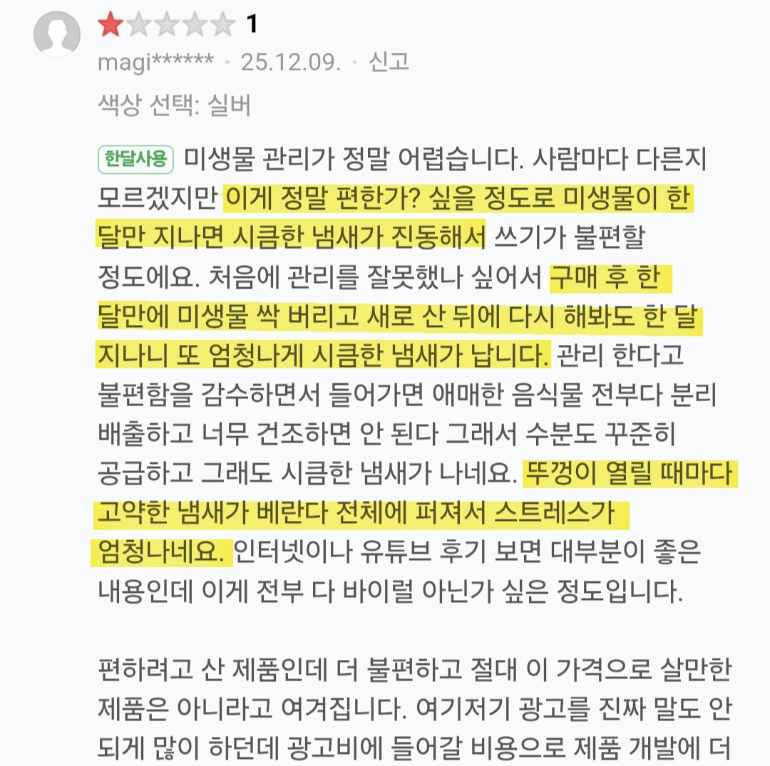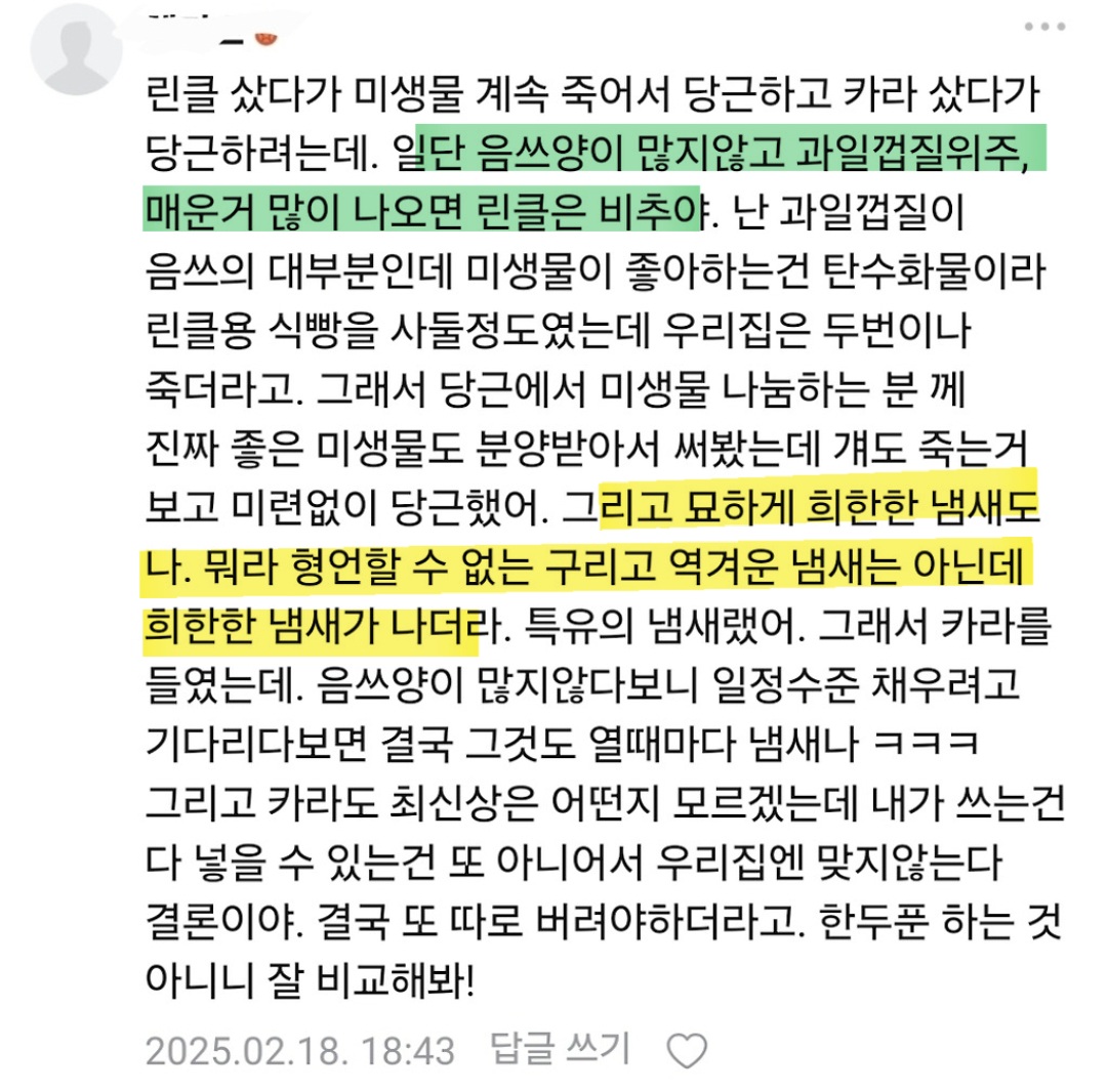 작성자올리브진저 작성시간 26.02.02 나 4년 썼는데 3년은 냄새 걱정 1도 안하고 잘 쓰다가 갑자기 냄새 개역겨웅거나고 에이에스도 계속 보내고 아예 미생물 새로 받아서 해서 겨우 살려냄...