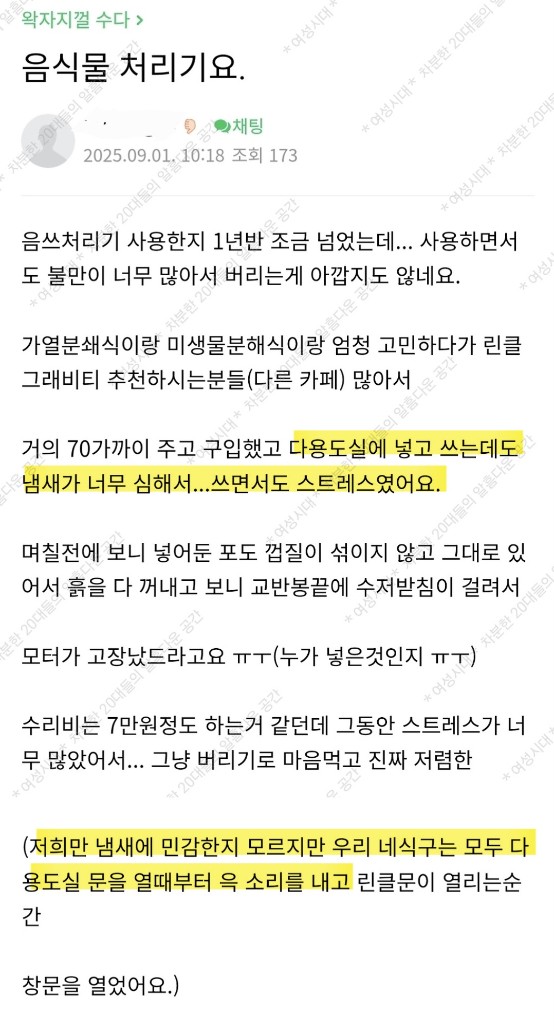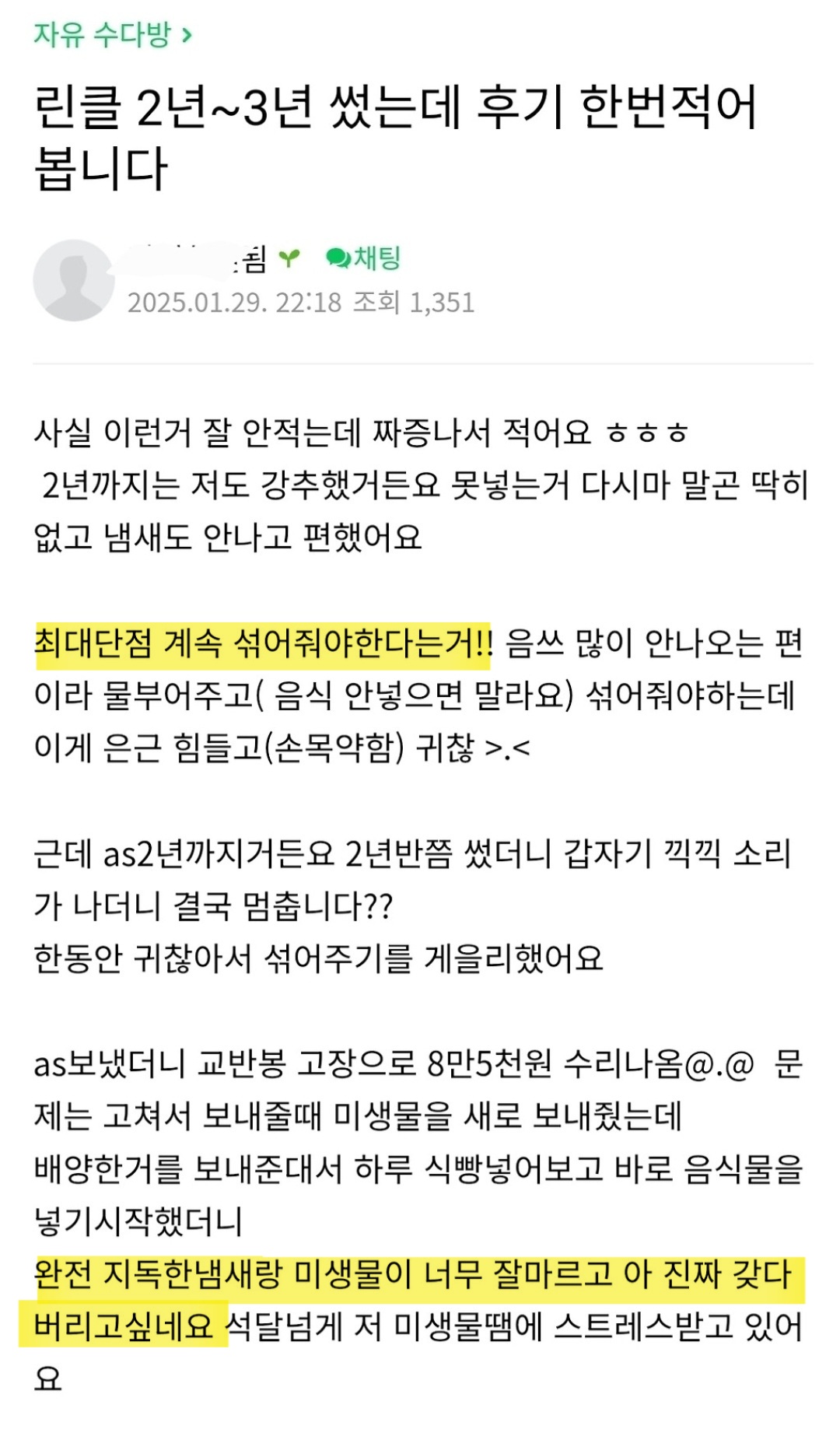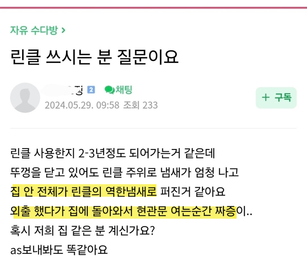 작성자올리브진저 작성시간 26.02.02 나 4년 썼는데 3년은 냄새 걱정 1도 안하고 잘 쓰다가 갑자기 냄새 개역겨웅거나고 에이에스도 계속 보내고 아예 미생물 새로 받아서 해서 겨우 살려냄...