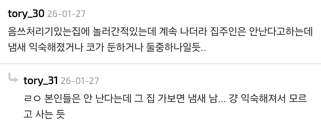 작성자프라다맥파든 작성시간 26.01.28 집냄새 된다는게 개소름이닼ㅋㅋㅋ 냄새 안난다고 주장하지만 손님들은 다 아는.. 그거 옷에서도 나잖아 집냄샠ㅋㅋㅋ