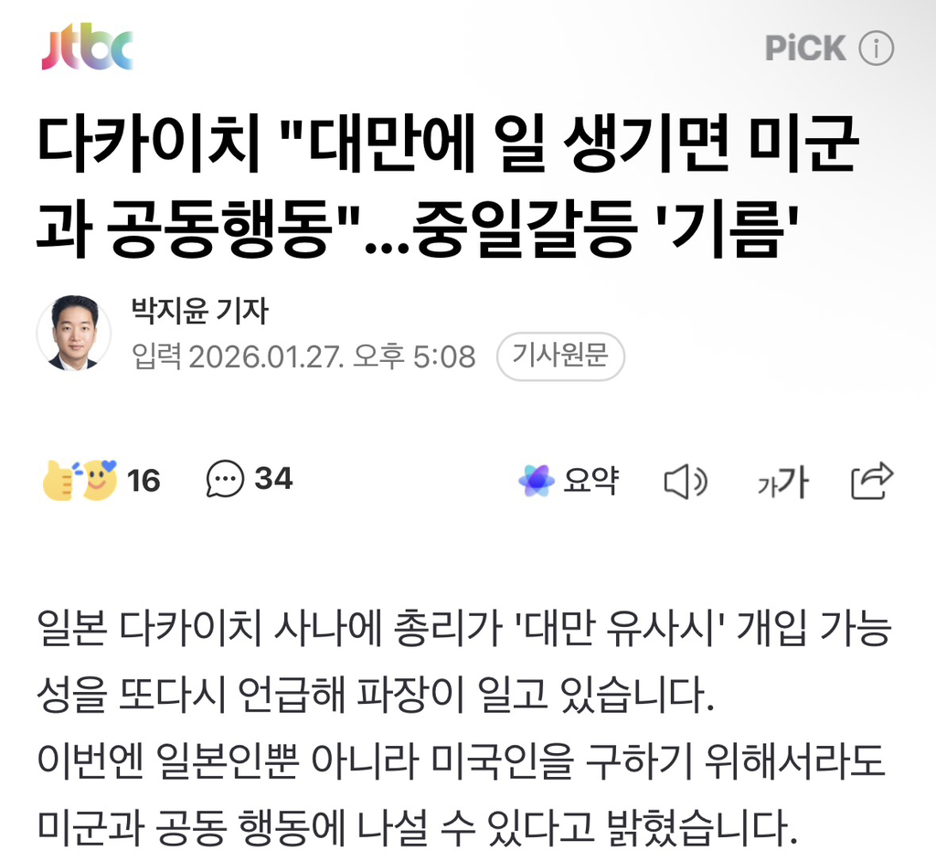 [여시뉴스데스크]다카이치 "대만에 일 생기면 미군과 공동행동"...중일갈등 '기름' 작성자소리앙|작성시간26.01.27|조회수2,732 목록 댓글 5 글자크기 작게가 글자크기 크게가 출처: https://naver.me/5CFTZXEO다카이치 "대만에 일 생기면 미군과 공동행동"...중일갈등 '기름'일본 다카이치 사나에 총리가 '대만 유사시' 개입 가능성을 또다시 언급해 파장이 일고 있습니다. 이번엔 일본인뿐 아니라 미국인을 구하기 위해서라도 미군과 공동 행동에 나설 수 있다고 밝혔n.news.naver.com전문출처 다음검색 현재 게시글 추가 기능 열기 북마크 공유하기 신고 센터로 신고 댓글 댓글 5 댓글쓰기 답글쓰기 댓글 리스트 작성자소금빵설탕빵 | 작성시간 26.01.27 뭐믿고 저래..? 답댓글 작성자I N T P | 작성시간 26.01.27 2월에 선거 있대ㅋㅋㅋㅋㅋㅋㅋ 답댓글 작성자부산콘서트홀 | 작성시간 26.01.27 미국 작성자돈 워리 비 회피 | 작성시간 26.01.27 며칠전에 깨갱하더니 다시 저러네… 작성자대한민국 대통령 이재명입니다 | 작성시간 26.01.27 정작 중국 전쟁할 생각 별로 없었는데 미국 일본이 전쟁 나라고 적극 부추기는데..? 댓글 전체보기