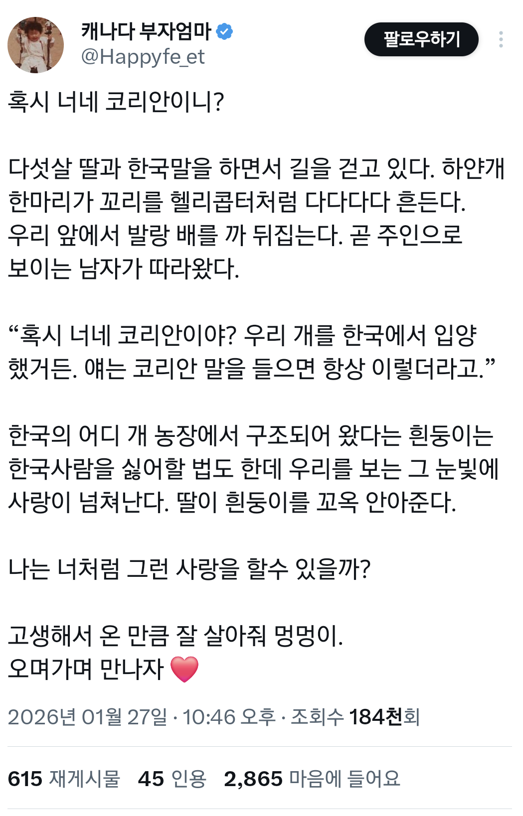 [흥미돋]혹시 너네 코리안이니?.X 작성자마이코박테리움|작성시간26.01.28|조회수95,247 목록 댓글 197 글자크기 작게가 글자크기 크게가 출처: 여성시대 (마이코박테리움)https://x.com/i/status/2016145730092859727 다음검색 현재 게시글 추가 기능 열기 북마크 공유하기 신고 센터로 신고 댓글 댓글 197 댓글쓰기 답글쓰기 댓글 리스트 작성자98년도에는요 | 작성시간 26.01.29 개농장이었는데도...ㅠㅠㅠ하 행복하길..ㅠㅠ 작성자이파리파 | 작성시간 26.01.29 ㅠㅠㅠㅠㅠㅠ 작성자주민진 | 작성시간 26.01.30 흰둥아ㅠㅠㅠㅠ 장수해서 대학가자 작성자보리밥밥디라라 | 작성시간 26.01.30 ㅠㅠㅠㅠㅠㅠㅠㅠㅠㅠㅠㅠㅠㅠㅠㅠㅠㅠㅠ 작성자홈런볼런홈 | 작성시간 26.02.08 강아지야 ㅠㅠㅠㅠ 댓글 전체보기