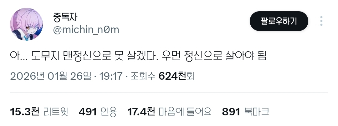 [흥미돋]아... 도무지 맨정신으로 못 살겠다 작성자카이지|작성시간26.01.28|조회수19,900 목록 댓글 3 글자크기 작게가 글자크기 크게가 출처: https://twitter.com/michin_n0m/status/2015730782728593681?t=AvukAGu-geaYGujzyt63fw&s=19https://twitter.com/michin_n0m/status/2015730782728593681?t=AvukAGu-geaYGujzyt63fw&s=19올 한 해는 우먼 정신으로 살아보자 다음검색 현재 게시글 추가 기능 열기 북마크 공유하기 신고 센터로 신고 댓글 댓글 3 댓글쓰기 답글쓰기 댓글 리스트 작성자Lauryn Hill | 작성시간 26.01.28 맞지맞지 작성자HD VOICE | 작성시간 26.01.28 여자들아기죽지마라당당하게외쳐라남자들아비켜라여자들의의리가더멋있잖아사랑보다강하잖아 작성자나다시태어날래 | 작성시간 26.01.28 ㅋㅋㅋㅋㅋㅋㅋㅋ 댓글 전체보기