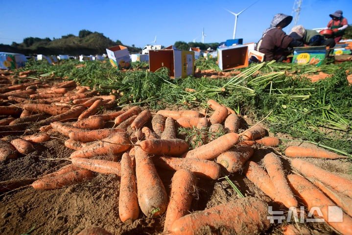 [제주=뉴시스] 우장호 기자 = 전국 최대 당근 산지인 제주시 구좌읍에서 농민들이 제철 당근을 수확하고 있는 모습. (사진=뉴시스 DB) 2025.12.30. photo@newsis.com[제주=뉴시스] 김수환 기자 = 제주시는 올해산 당근의 과잉 생산과 소비 침체 문제를 해소하기 위해 '제주산 당근 소비 촉진 운동'을 전개했다고 28일 밝혔다.