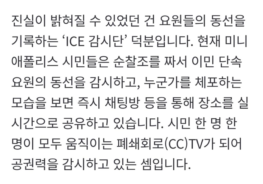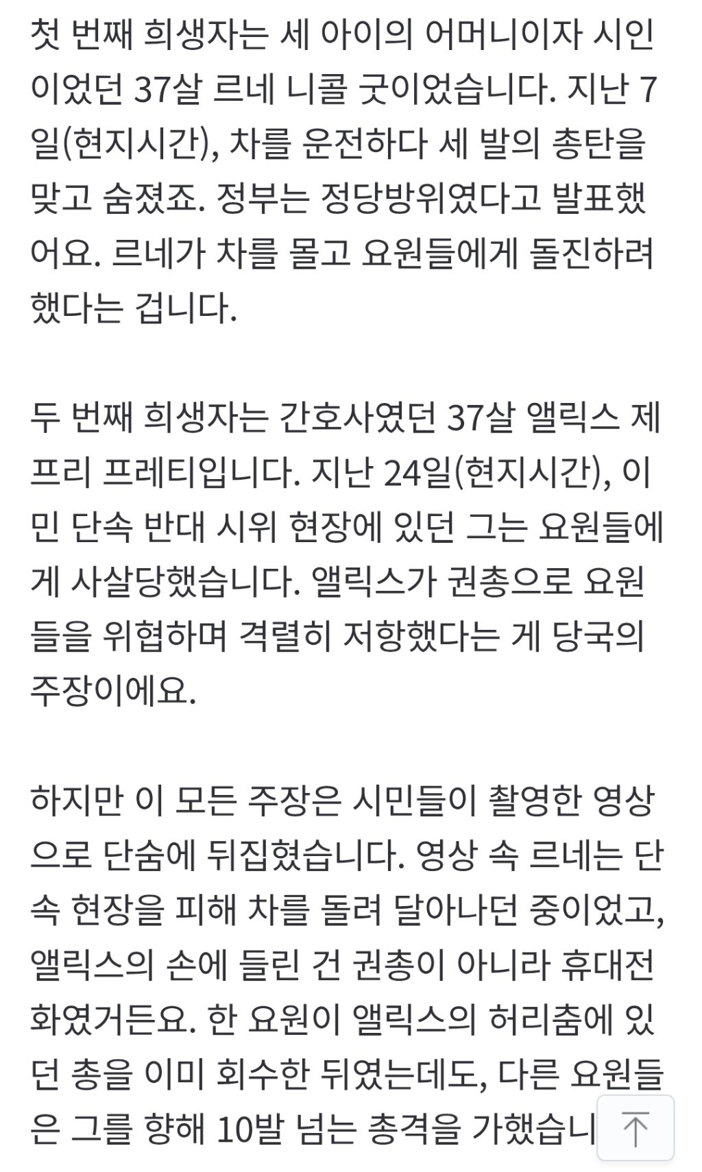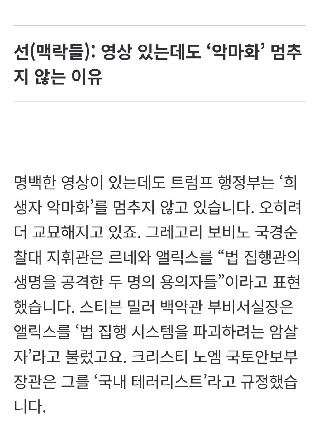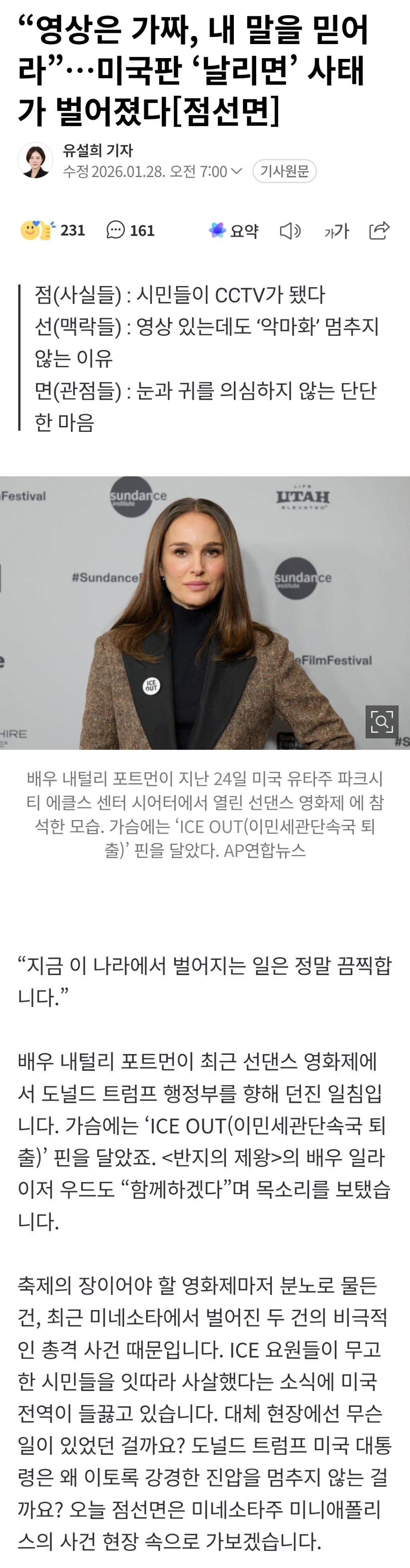[여시뉴스데스크]“영상은 가짜, 내 말을 믿어라”…미국판 ‘날리면’ 사태가 벌어졌다 작성자퇴사하고싶고그런상태|작성시간26.01.28|조회수2,397 목록 댓글 2 글자크기 작게가 글자크기 크게가 출처: https://n.news.naver.com/mnews/ranking/article/032/0003424242?ntype=RANKING“영상은 가짜, 내 말을 믿어라”…미국판 ‘날리면’ 사태가 벌어졌다[점선면]“지금 이 나라에서 벌어지는 일은 정말 끔찍합니다.” 배우 내털리 포트먼이 최근 선댄스 영화제에서 도널드 트럼프 행정부를 향해 던진 일침입니다. 가슴에는 ‘ICE OUT(이민세관단속국 퇴출)n.news.naver.com 다음검색 현재 게시글 추가 기능 열기 북마크 공유하기 신고 센터로 신고 댓글 댓글 2 댓글쓰기 답글쓰기 댓글 리스트 작성자다이어틈 | 작성시간 26.01.28 아니진짜어떻게되는거야.. 작성자폴인라브방콕 | 작성시간 26.01.28 나탈리포트만..!!!! 응원해 댓글 전체보기