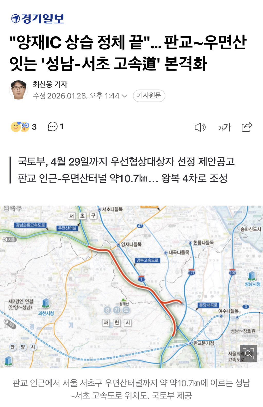 국토부 이우제 도로국장은 “이번 사업은 경부고속도로 양재IC 인근 상습정체 구간의 교통 부담을 분산하고, 성남과 판교 등 수도권 남부 지역에서 서울로 이동하는 시간을 줄이기 위한 사업”이라며 “계획대로 사업이 추진되면 국민 이동 시간이 줄고, 도로 이용 편의 및 경부고속도로의 간선 기능도 함께 높아질 것으로 기대된다”고 말했다.