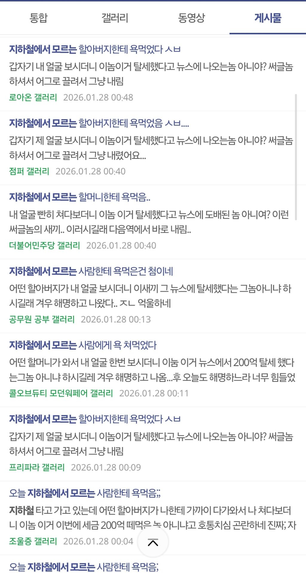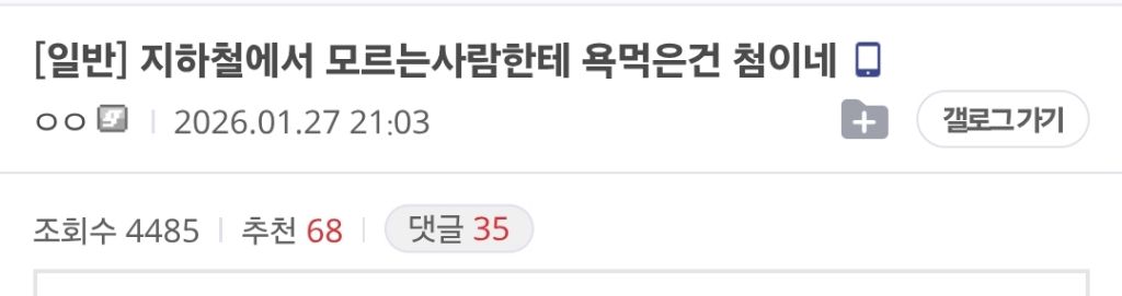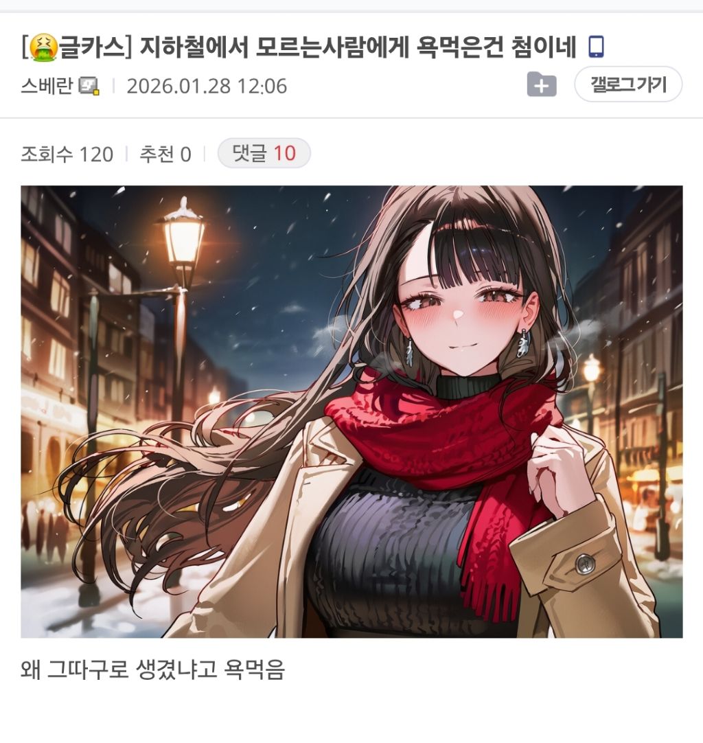 [흥미돋]지하철에서 모르는 사람한테 욕 먹은건 첨이네 작성자이재는이재명|작성시간26.01.29|조회수15,995 목록 댓글 12 글자크기 작게가 글자크기 크게가 출처: 여성시대 이재는이재명 ㄷㅆ 이 글이 시작인지는 모르겠는데 그 뒤내 세상이 무너졌어 처럼창의성이라도 있던가ㅋㅋ 다음검색 현재 게시글 추가 기능 열기 북마크 공유하기 신고 센터로 신고 댓글 댓글 12 댓글쓰기 답글쓰기 댓글 리스트 작성자디카페인코크 | 작성시간 26.01.29 저런걸 왜 따라해 다들 관종들인가 작성자오늘은짬뽕 | 작성시간 26.01.29 개구려 작성자추초노 | 작성시간 26.01.29 그... 아니다 작성자열여섯개 월남아 | 작성시간 26.01.29 걍 이거같은...... 농담같은데........ 마루머쓱 이미지 확대 답댓글 작성자채소쨥쨥 | 작성시간 26.01.29 다들 아는데 재미도 없고 감동도 없어서 욕하는 듯... 댓글 전체보기