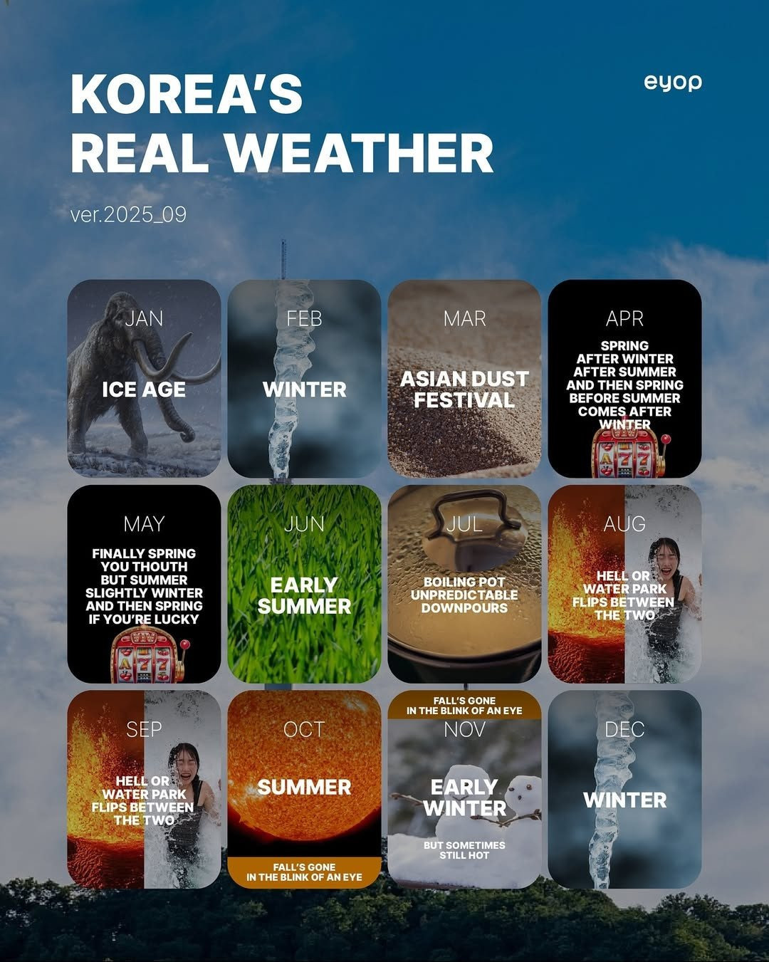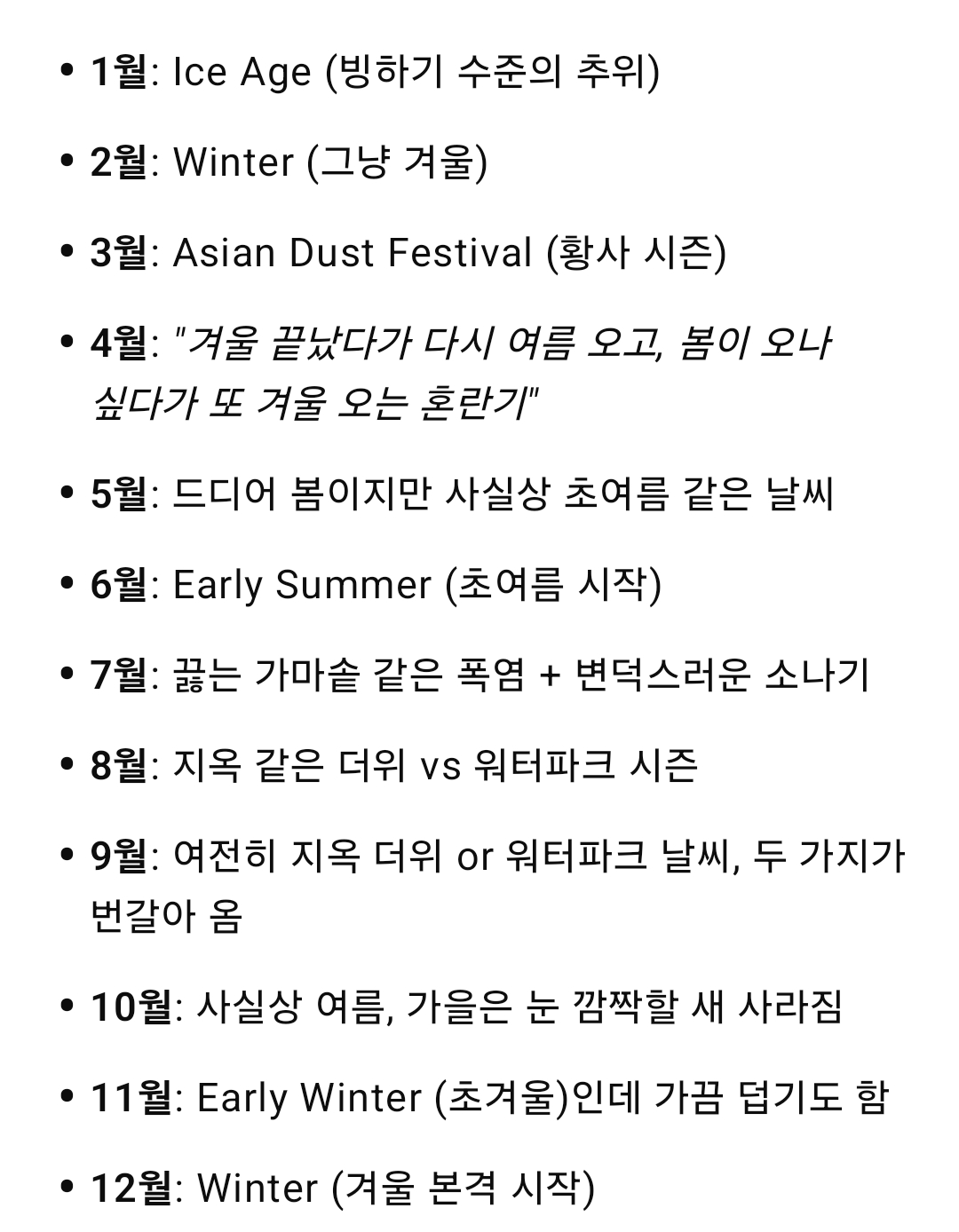 [스크랩] [흥미돋]외국에서 보는 한국 월별 날씨 작성자flflf|작성시간26.01.29|조회수19,674 목록 댓글 21 글자크기 작게가 글자크기 크게가 출처: 여성시대 (본인) 다음검색 스크랩 원문 : *여성시대* 차분한 20대들의 알흠다운 공간 현재 게시글 추가 기능 열기 북마크 공유하기 신고 센터로 신고 댓글 댓글 21 댓글쓰기 답글쓰기 댓글 리스트 작성자한달100키로뛰기 | 작성시간 26.01.29 개웃기네 작성자바이오더마포마드 | 작성시간 26.01.29 정확하군ㅋㅋ 작성자짹더리퍼 | 작성시간 26.01.29 저렇게 보니까 한국여행하기 빡센 나라네 ㅋㅋㅋㅋ 작성자라리루레로 | 작성시간 26.01.29 진짜 개 정확하다 한국에서 살아남기 엄청난 신체 정신적 에너지 소모 작성자후라이풍자여름 | 작성시간 26.01.29 그치만...! 날씨 좋은날도 종종있는데ㅎㅎㅋㅎㅎㅎㅋ 댓글 전체보기