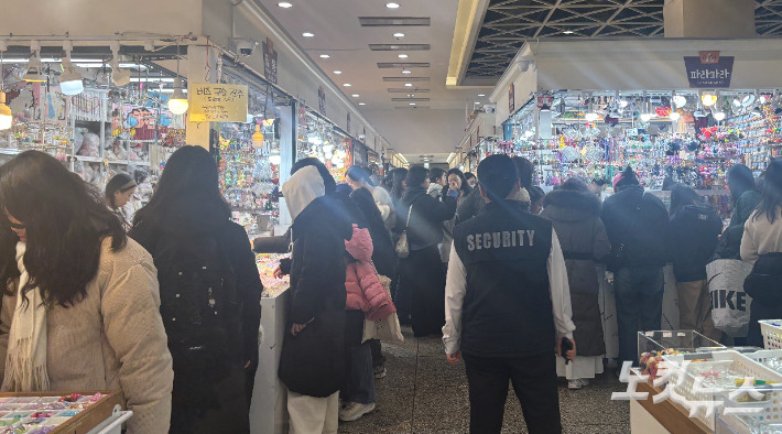 20일 오전 서울 종로구 동대문종합시장 5층 액세서리 상가 통로에는 오픈 직후부터 사람들이 몰렸다. 양쪽 매대 앞에 손님들이 두 줄로 길게 늘어서면서 통로 중앙에는 성인 한 명이 겨우 지나갈 정도의 공간만 남았다.