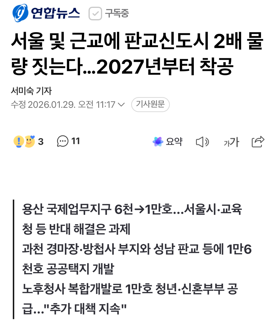 [여시뉴스데스크]서울 및 근교에 판교신도시 2배 물량 짓는다…2027년부터 착공 작성자설루션|작성시간26.01.29|조회수8,581 목록 댓글 18 글자크기 작게가 글자크기 크게가 출처: 여성시대 설루션출처 : https://naver.me/GvfE9BHh서울 및 근교에 판교신도시 2배 물량 짓는다…2027년부터 착공용산 국제업무지구 6천→1만호…서울시·교육청 등 반대 해결은 과제 과천 경마장·방첩사 부지와 성남 판교 등에 1만6천호 공공택지 개발 노후청사 복합개발로 1만호 청년·신혼부부 공급…"추n.news.naver.com전문 출처로 다음검색 현재 게시글 추가 기능 열기 북마크 공유하기 신고 센터로 신고 댓글 댓글 18 댓글쓰기 답글쓰기 댓글 리스트 작성자펭귄광공 | 작성시간 26.01.29 쓰레기장이나 지어…. 작성자AMDL | 작성시간 26.01.29 수도권 300만호 한다며 이 속도로 가능할까? 작성자인중꼬순내 | 작성시간 26.01.29 녹지확보 기준도 개정하면서 빡빡하게 지어두는게 맞나ㅠㅠ… 지방을 키우는게…. 아이고…녹지좀 줘…. 작성자요추염좌최악임조심하셈 | 작성시간 26.01.29 서울에서 안살아도 되게 만들면 되는데.. 작성자사과존맛 | 작성시간 26.01.29 저거 합의보는데 20년 걸림 댓글 전체보기