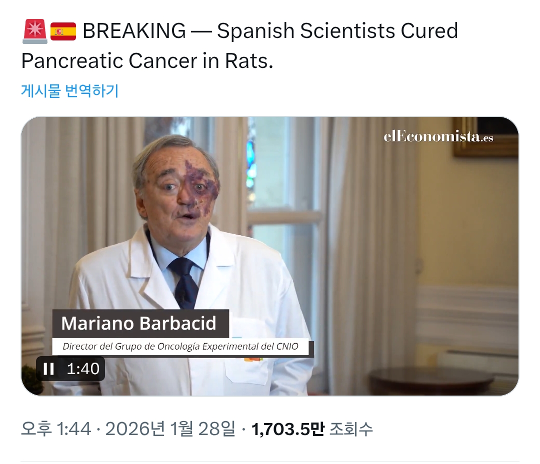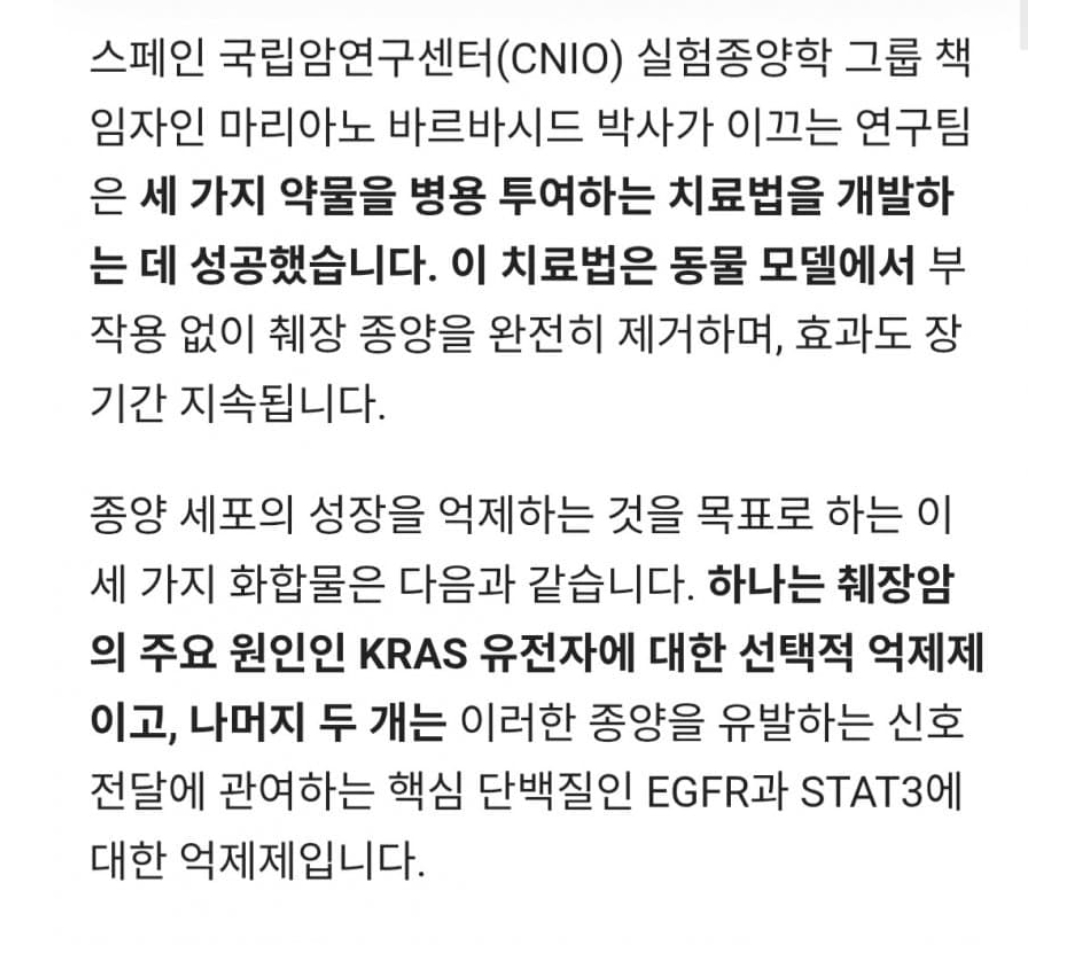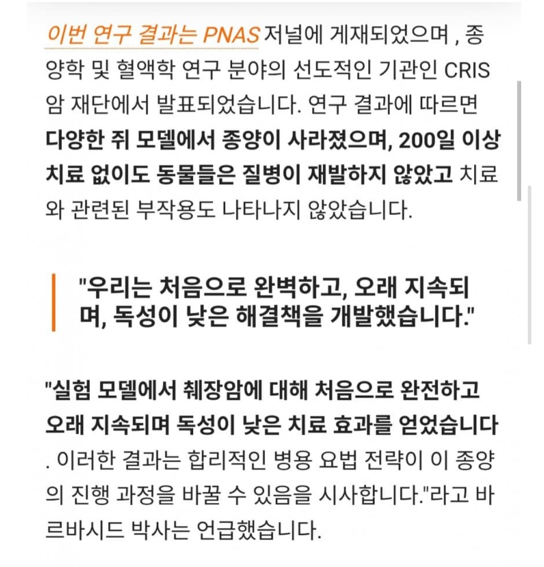 쥐의 췌장암을 치료하는데 성공해서 췌장암 치료에 희망이 생김