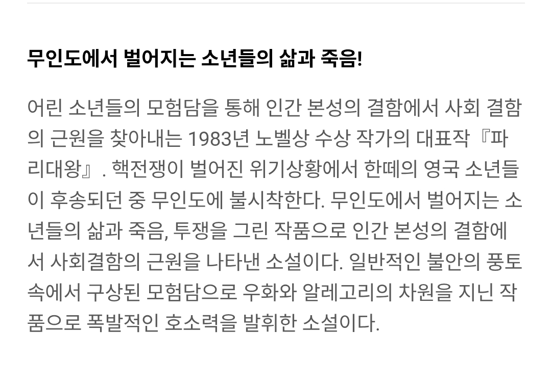 [흥미돋]소설원작 <파리대왕> BBC 드라마 예고편 작성자bllinding|작성시간26.01.29|조회수9,281 목록 댓글 40 글자크기 작게가 글자크기 크게가 출처: 여성시대 bllinding무인도에 불시착한 영국 소년들이 극한 상황에서 문명과 야만 사이에서 갈등하다가 결국 파멸적인 야만 상태로 빠져든다윌리엄 골딩 소설 원작안경은 넷플 나니아연대기 주인공이고금발 뽀글이는 HBO해리포터 말포이 배우임영국 2월 방송아직 한국공개 계획 없음 다음검색 현재 게시글 추가 기능 열기 북마크 공유하기 신고 센터로 신고 댓글 댓글 40 댓글쓰기 답글쓰기 댓글 리스트 작성자YAMAMOTO KYOKA | 작성시간 26.01.29 넘기대 작성자천년의노래 | 작성시간 26.01.29 와 넘 궁금했는데 작성자허드슨 | 작성시간 26.01.30 존잼이겠다 작성자집에보내달라고 | 작성시간 26.03.19 와 새끼돼지 싱크로 뭐야 재밌겠다 작성자Lionel Andres Messi | 작성시간 26.03.28 와 돼지 내가 진짜 딱 생각하던 것처럼 생겼어;;;(인신공격 x 작중에서 그렇게 불림) 댓글 전체보기