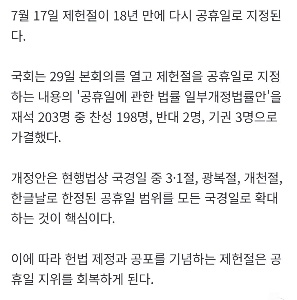 [여시뉴스데스크][속보] 제헌절, 올해부터 다시 ‘빨간날’…국회 본회의 통과 작성자Oasis|작성시간26.01.29|조회수52,743 목록 댓글 417 글자크기 작게가 글자크기 크게가 출처: https://n.news.naver.com/article/422/0000828105?sid=100[속보] 제헌절 공휴일 재지정 법안 국회 본회의 통과연합뉴스TV 기사문의 및 제보 : 카톡/라인 jebo23n.news.naver.com내용있는걸로 다시 가져왔어요전문은 링크에서 다음검색 현재 게시글 추가 기능 열기 북마크 공유하기 신고 센터로 신고 댓글 댓글 417 댓글쓰기 답글쓰기 댓글 리스트 작성자꿀꿀냠냠 | 작성시간 26.01.30 작성자파란색88 | 작성시간 26.01.30 작성자나애아바디 | 작성시간 26.01.30 굿 작성자Blueheart | 작성시간 26.01.30 으아아아아악 ㅠㅠㅠㅠ넘좋아 작성자뉴뉴냐냐시계 | 작성시간 26.01.31 굿굿 댓글 전체보기