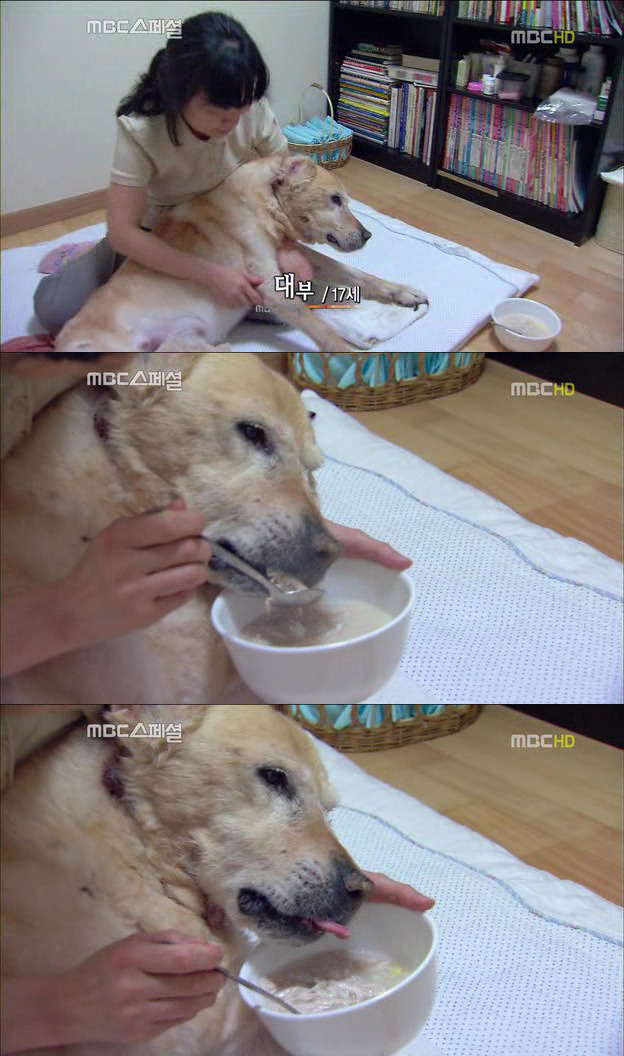 하루종일 생기 없어 보이던 대부가 고기 냄새를 맡더니 신이난 듯 맛을 본다.