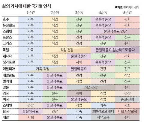 작성자딥치즈 베이컨 포테이토 작성시간 26.01.30 우리나라는 전쟁 겪고 너무 힘든 시기를 거쳐와서 그렇다고 했었는데..가족을 지키기 위한 물질적 풍요가 1위라고 전에 봤던 영상 생각난다