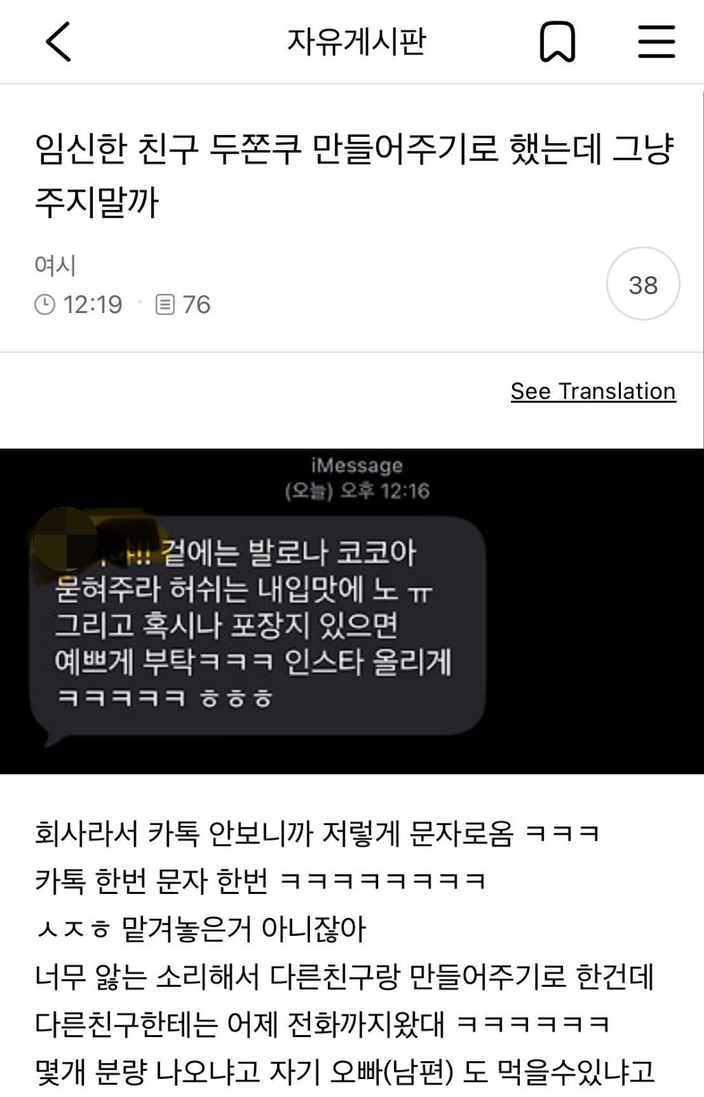 [스크랩] [흥미돋]임신한 친구 두쫀쿠 만들어주기로 했는데 그냥 주지말까 작성자Rooose|작성시간26.01.29|조회수36,963 목록 댓글 121 글자크기 작게가 글자크기 크게가 출처: 여성시대 여단오여 원글은 삭제 된 듯 하고x며,스레드며 인터넷에 떠도는 중글쓴여시 진짜 착하다...발로나랑 허쉬랑 단가 차이도 단가차이며..할말하않..글쓴여시 삭제 원하면 비댓 줘.. 다음검색 스크랩 원문 : *여성시대* 차분한 20대들의 알흠다운 공간 현재 게시글 추가 기능 열기 북마크 공유하기 신고 센터로 신고 댓글 댓글 121 댓글쓰기 답글쓰기 댓글 리스트 작성자블루샥 | 작성시간 26.01.30 주는대로 감사히 먹지 왜저래 미쳤나 작성자느ㅣ개비최종학력리박스쿨 | 작성시간 26.01.30 내입맛에 노 <- 이거 너무 킹받아 ㅋㅋㅋㅋㅋㅋㅋㅋㅋㅋ 안해줘야지 뭘 저런걸 들어줘 작성자쓰레기는 쓰레기통에 | 작성시간 26.01.30 그러면 걍 니가 해먹어 이러고 안 해줌 작성자shineonme | 작성시간 26.01.30 진짜 싫다.. 사람의 호의를.. 작성자9와4분의3두쫀쿠 | 작성시간 26.01.31 안해줌 댓글 전체보기