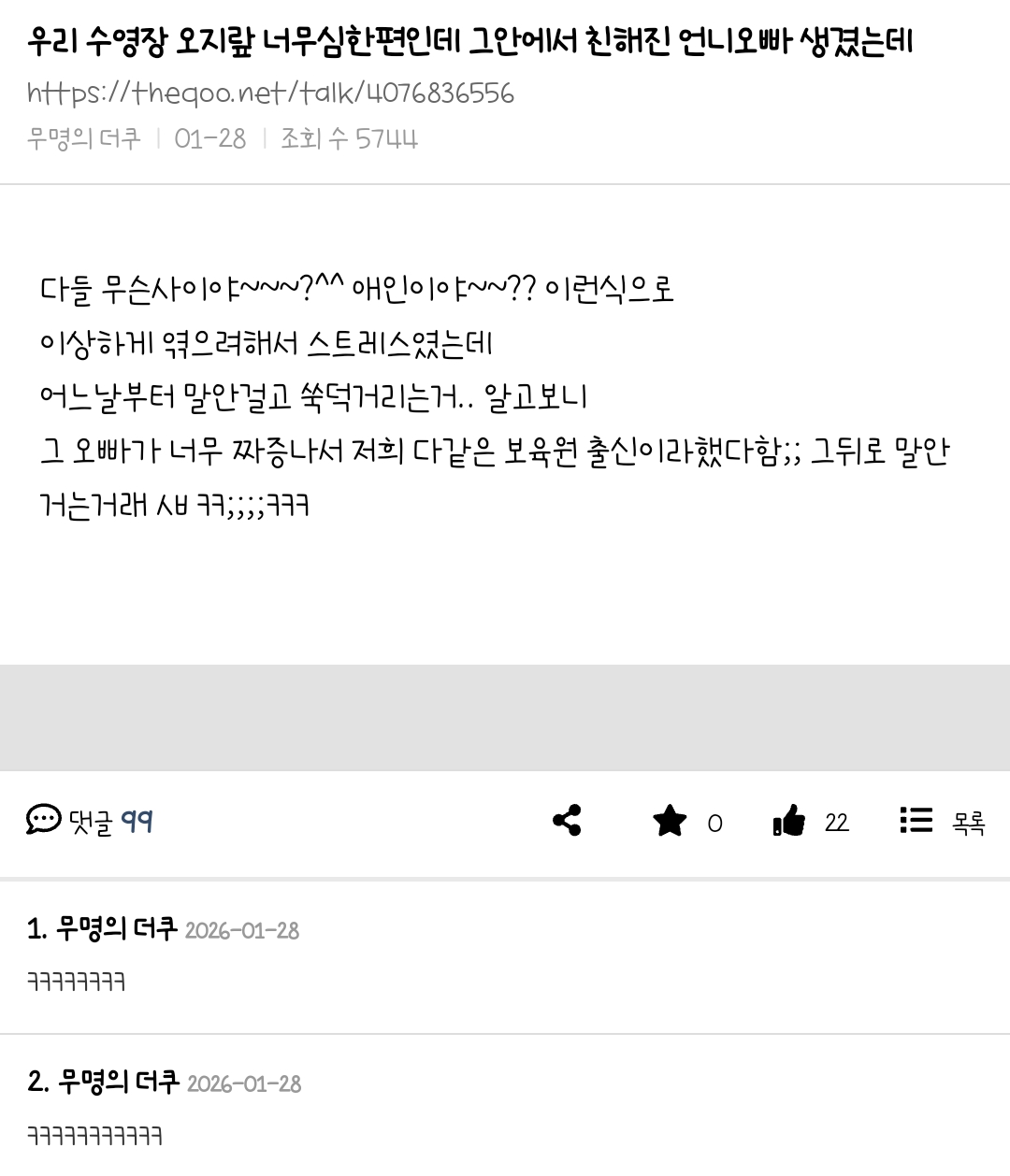 [흥미돋]우리 수영장 오지랖 너무심한편인데 그안에서 친해진 언니오빠 생겼는데 작성자세 레나|작성시간26.01.29|조회수96,467 목록 댓글 79 글자크기 작게가 글자크기 크게가 출처: https://theqoo.net/talk/4076836556 다음검색 현재 게시글 추가 기능 열기 북마크 공유하기 신고 센터로 신고 댓글 댓글 79 댓글쓰기 답글쓰기 댓글 리스트 작성자쟝포니 | 작성시간 26.01.30 보법이 다르다 시밬ㅋㅋㅋㅋㅋ 아무래도 수영을 해서 작성자알빠여 | 작성시간 26.01.30 고아연합인줄알고 안건드나벼 ㅋㅋㅋ 작성자암국 | 작성시간 26.01.30 ㅋㅋㅋㅋㅋㅋㅋㅋ 작성자말하기전에 두 번 생각했나요? | 작성시간 26.01.30 ㅋㅋㅋㅋㅋㅋㅋㅋㅋ 웃기다 ㅋㅋㅋㅋㅋㅋ 작성자안녕허손요 | 작성시간 26.02.07 제갈량이 따로 없네 댓글 전체보기