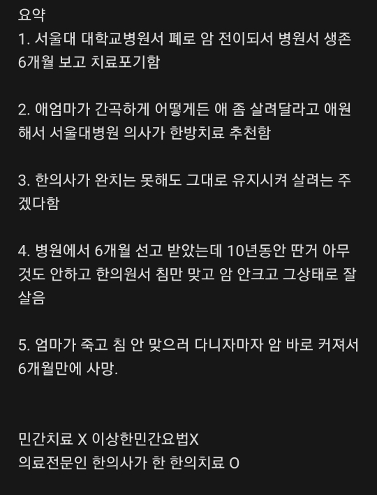 작성자흠냐리리리리리 작성시간 26.01.30 반대케이스도 있어...한의학 믿고 치료 병원안갔다가 돌아가신...