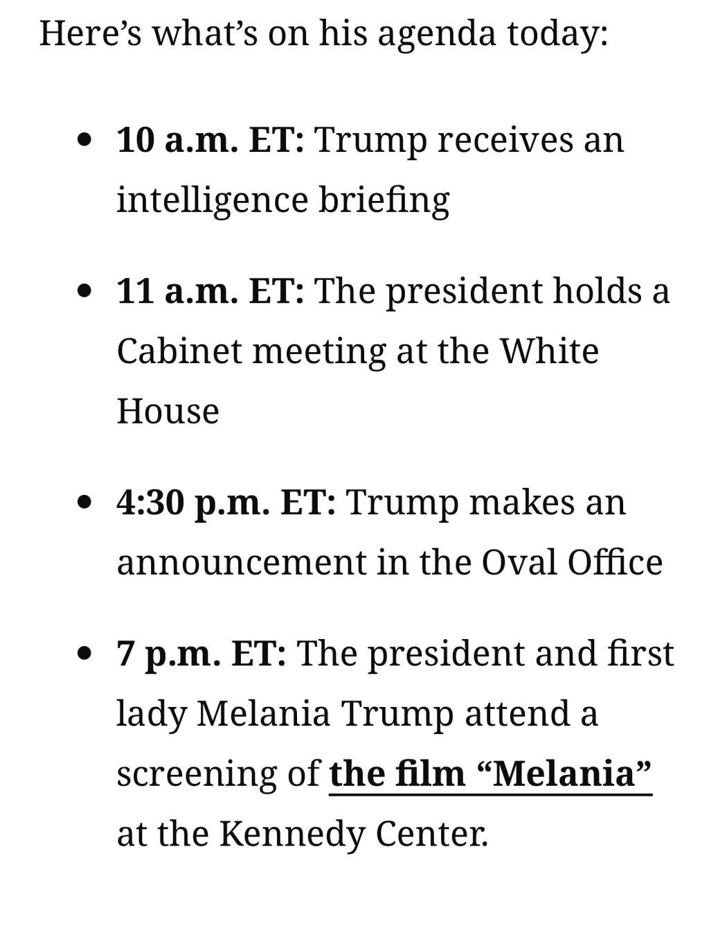 오후 7시 ET: 대통령과 영부인 멜라니아 트럼프가 케네디 센터에서 영화 “멜라니아” 상영회에 참석합니다