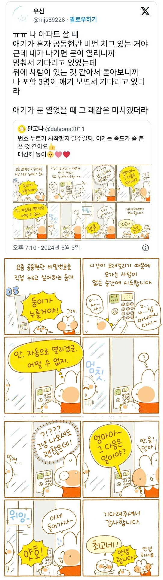 작성자성선설의마지막희망 작성시간 26.01.31 나도 저번에 애기랑 엘베 탔는데, 문옆에 있는 세로로 된 거 말고 당연히 옆에 가로로 낮게 위치해있는 버튼 누를 줄 알고 내 것만 눌렀는데 안 누르는거야. 그래서 힐금 뒤에 봤더니