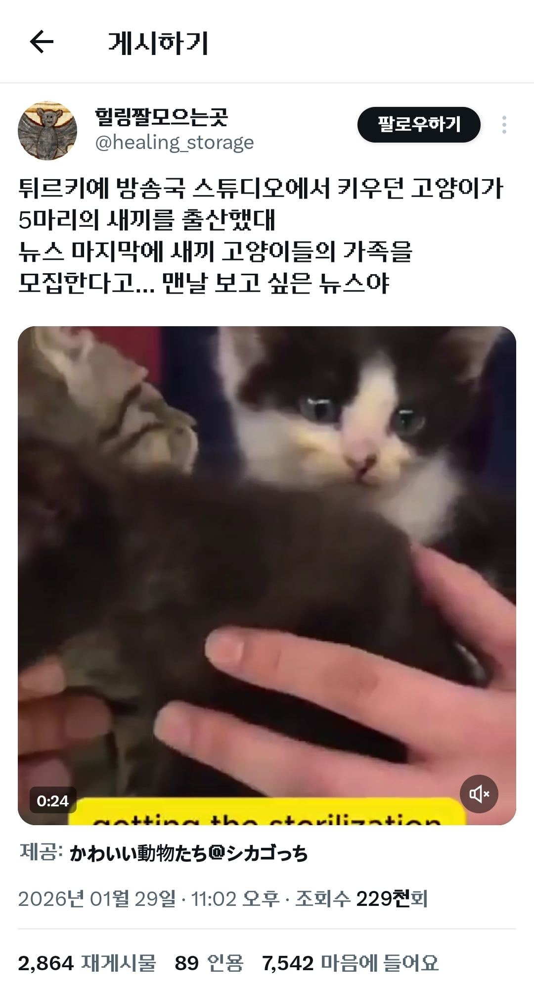 [힐링]튀르키예 방송국 스튜디오에서 키우던 고양이가 5마리의 새끼를 출산했대.x 작성자누룩곰팡이|작성시간26.01.30|조회수12,280 목록 댓글 30 글자크기 작게가 글자크기 크게가 출처: https://x.com/i/status/2016874655198642484ㅁㅂ나도 저런 뉴스만 보고싶다 ..🥹 다음검색 현재 게시글 추가 기능 열기 북마크 공유하기 신고 센터로 신고 댓글 댓글 30 댓글쓰기 답글쓰기 댓글 리스트 작성자마싯는시밤바 | 작성시간 26.01.30 얼마나 이뻐죽겄으면 촉 규젤×100 ㅋㅋ 작성자닥쳐 | 작성시간 26.01.30 아 ㅈㄴ 행복 작성자사탄의뚝배기 | 작성시간 26.01.30 촉 규젤 <터키 갔다온 여시들은 다 아는 말일듯 ㅋㅋ 작성자쟝포니 | 작성시간 26.01.30 어미 고양이 보고 방송국의 딸이래 ㅜㅜ 넘 좋다 작성자메론주스 | 작성시간 26.04.08 자막땜에 고양이 안보여요ㅠㅋ̤̮ 댓글 전체보기