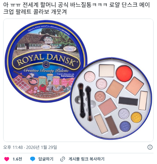 [흥미돋]할머니의 쿠키통과 콜라보 하는 화장품 작성자귤토끼이|작성시간26.01.30|조회수49,876 목록 댓글 11 글자크기 작게가 글자크기 크게가 출처: https://theqoo.net/square/4078139258 https://x.com/beanpicker/status/2016886239136460939?s=20 다음검색 현재 게시글 추가 기능 열기 북마크 공유하기 신고 센터로 신고 댓글 댓글 11 댓글쓰기 답글쓰기 댓글 리스트 작성자대도서관 | 작성시간 26.01.30 ㅋㅋㅋㅋㅋㅋㅋㅋ 나올때 됐지! 작성자까뮈 | 작성시간 26.01.30 좋다 저런거 너무 좋아 내취향 ㅋㅋㅋ 작성자구도훈 | 작성시간 26.01.30 ㅁㅊㅋㅋㅋㅋㅋㅋㅋㅋ 작성자비비안수 | 작성시간 26.01.30 단추 모양 귀여워 작성자lily of the valley | 작성시간 26.01.30 뭐야 내스탈... 감다살이네할미취향들 다 달려갈듯 댓글 전체보기