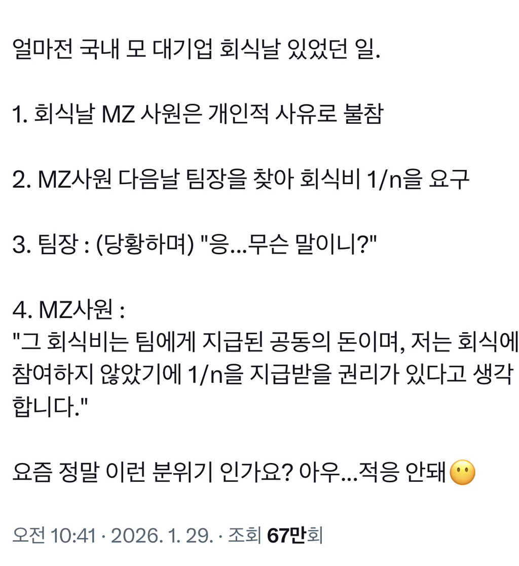 [흥미돋]어느 대기업에서 회식비 엔빵을 요구한 MZ 사원 작성자Rooose|작성시간26.01.30|조회수142,820 목록 댓글 272 글자크기 작게가 글자크기 크게가 출처: https://x.com/drmusician1/status/2016688178779083205?s=46&t=49r3Kw6TNqvpiTF8J4JDaA 다음검색 현재 게시글 추가 기능 열기 북마크 공유하기 신고 센터로 신고 댓글 댓글 272 댓글쓰기 답글쓰기 댓글 리스트 작성자주4일제까지숨참음 | 작성시간 26.02.04 충격적🫠 작성자앵카인앵앵카인 | 작성시간 26.02.05 돈걷어서 하는 병동은 이랬었음 작성자엑슨 | 작성시간 26.02.06 도랏나… 갑근세 떼고 줄게^^ 작성자아바디벵 | 작성시간 26.02.07 저런건 어디서 배우는거임..? 작성자둘리두 | 작성시간 26.02.07 ㅋㅋ.. 회식 불참이잖아 개인돈으로 쓰라고 준게 아닌데 댓글 전체보기