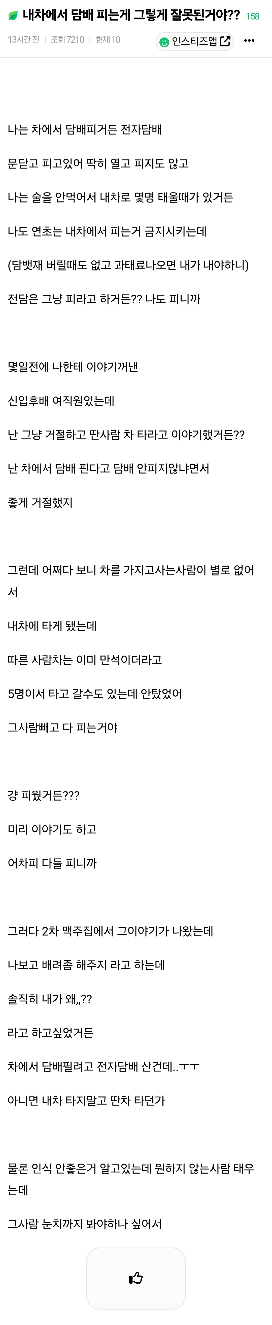 작성자시보 작성시간 26.02.02 나도 흡연자고 친구들도 흡연해서 차타면 같이 흡연하는데 비흡타면 참음 솔직히 참을수 있는데 일부러 핀것 같음
