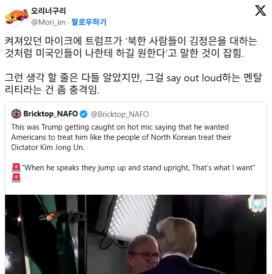 [흥미돋]도날드 트럼프 마이크 켜진채 한 발언 작성자귤토끼이|작성시간26.01.30|조회수61,700 목록 댓글 249 글자크기 작게가 글자크기 크게가 출처: https://theqoo.net/square/4078493598 https://x.com/mori_im/status/2017048350332506409?s=46 다음검색 현재 게시글 추가 기능 열기 북마크 공유하기 신고 센터로 신고 댓글 댓글 249 댓글쓰기 답글쓰기 댓글 리스트 작성자햄부기부기온앤온 | 작성시간 26.01.31 김정은이 부러워? 작성자박보람 | 작성시간 26.01.31 ㅋㅋㅋㅋㅋ그럴줄알음 작성자이리일디 | 작성시간 26.01.31 북한북한 거리더니 ㄹㅇ 북한 선망해서 그런거였냐 작성자둥둥배 | 작성시간 26.01.31 알면서 뽑은 줄 작성자귀뚜라미귀뚜라미 | 작성시간 26.02.01 진짜 독재하겠네 댓글 전체보기