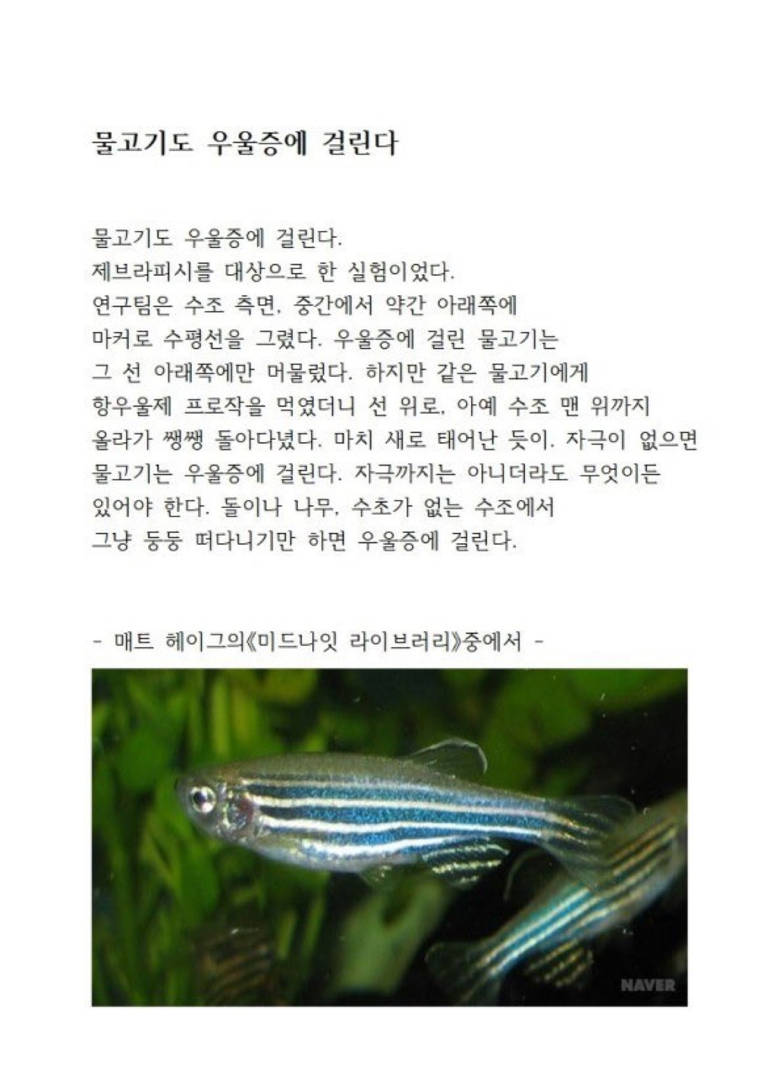 [스크랩] [흥미돋]물고기도 우울증에 걸린다 작성자어떠한|작성시간26.01.30|조회수6,436 목록 댓글 3 글자크기 작게가 글자크기 크게가 출처: https://x.com/kisses_ttg/status/1847245143537242430?s=46&t=KlDqBlNqBJ3fwIZTZ3FsOg 다음검색 스크랩 원문 : *여성시대* 차분한 20대들의 알흠다운 공간 현재 게시글 추가 기능 열기 북마크 공유하기 신고 센터로 신고 댓글 댓글 3 댓글쓰기 답글쓰기 댓글 리스트 작성자짹짹거리면.두들겨팸니다. | 작성시간 26.01.30 아쿠아리움 가면 너무 우울해서 인간사 환멸나더라ㅠㅠ....... 작성자고먐미빵뎅이 | 작성시간 26.01.30 프로작 다시 먹어야겠다 ㅠ 작성자해태홈런볼초코 | 작성시간 26.01.30 항우울제가 포유류가 아닌 어류에도 똑같이 작용한다니 신기하다.. 물살이들도 행복하길 댓글 전체보기