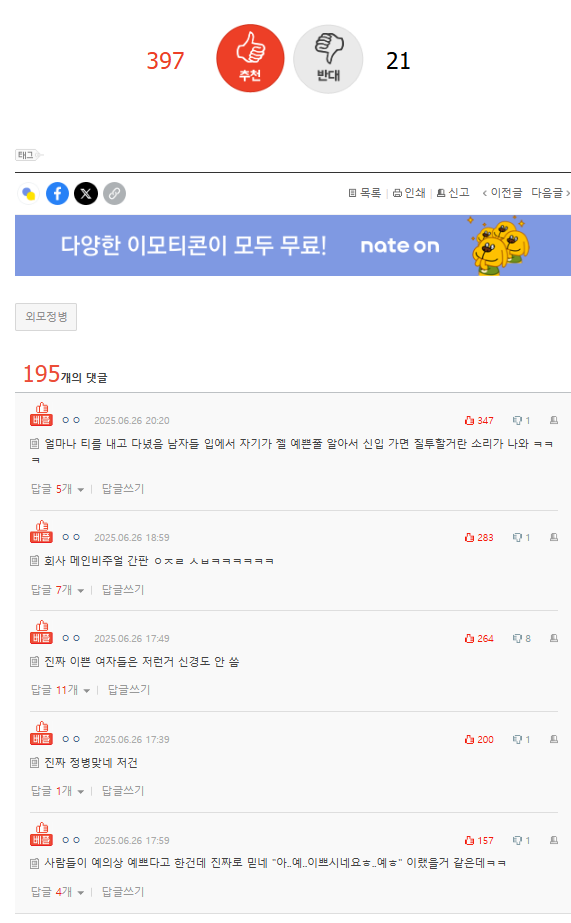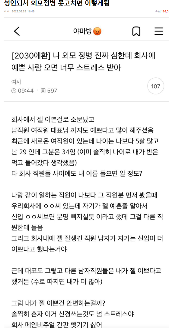 [스크랩] [흥미돋]나 외모 정병 진짜 심한데 회사에 예쁜 사람 오면 너무 스트레스 받아 작성자천명공주|작성시간26.01.30|조회수13,435 목록 댓글 64 글자크기 작게가 글자크기 크게가 출처: https://m.pann.nate.com/talk/374504463야마방 유출같음[네이트판] 성인돼서 외모 정병 못고치면 이렇게 됨오마이갓,, 다음검색 스크랩 원문 : *여성시대* 차분한 20대들의 알흠다운 공간 현재 게시글 추가 기능 열기 북마크 공유하기 신고 센터로 신고 댓글 댓글 64 댓글쓰기 답글쓰기 댓글 리스트 작성자냥르장머리 | 작성시간 26.01.31 ㄹㅇ병이다 작성자호랑이귀여워 | 작성시간 26.01.31 병원가야돼 작성자본업에충실하자 | 작성시간 26.01.31 와… 인생 너무 피곤하고 스트레스 받을듯.. 작성자뜨거운 방구 | 작성시간 26.01.31 저렇게는 안 늙어야지 작성자이리일디 | 작성시간 26.01.31 회사에서 메인간판해서 뭐함; 연옌도 아니고 댓글 전체보기