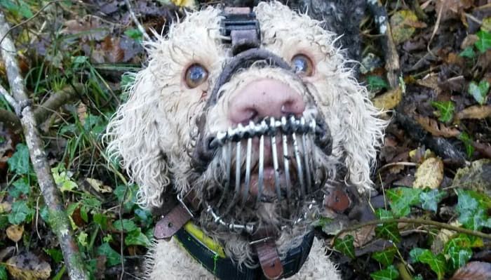 그가 공개한 사진 속 탐지견은 흙투성이 된 채, 마치 고문 도구를 연상시키는 금속성 입마개를 착용하고 있었습니다.