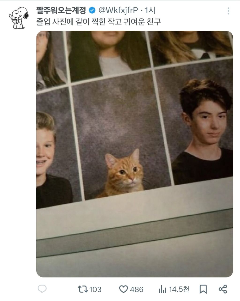 [흥미돋]졸업사진에 같이 찍힌 작고 귀여운 친구 작성자비혼주의다|작성시간26.01.30|조회수68,230 목록 댓글 30 글자크기 작게가 글자크기 크게가 출처: 여성시대 비혼주의다 다음검색 현재 게시글 추가 기능 열기 북마크 공유하기 신고 센터로 신고 댓글 댓글 30 댓글쓰기 답글쓰기 댓글 리스트 작성자천지안위 | 작성시간 26.01.31 귀여워ㅠㅠㅠㅠㅠ 작성자멕켄지데이비스 | 작성시간 26.01.31 늠름해 기야워 ㅜㅜ 작성자딥치즈 베이컨 포테이토 | 작성시간 26.01.31 맞지 학교생활 같이 한 친구 맞잖아ㅠ소중해 작성자Amoroso | 작성시간 26.01.31 아 귀염둥이ㅠㅠㅠㅠㅠ 작성자낮말은새가듣고반말하면뒤져 | 작성시간 26.02.01 우리반 빼고 다 나가라냥 댓글 전체보기