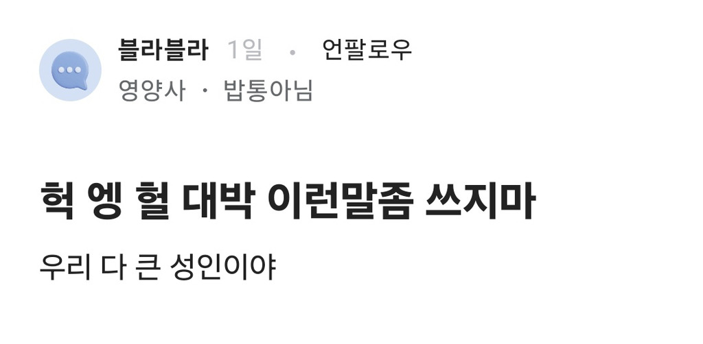 [스크랩] [흥미돋]헉 엥 헐 대박 이런 말 좀 쓰지 마 작성자이재는이재명|작성시간26.01.30|조회수39,865 목록 댓글 168 글자크기 작게가 글자크기 크게가 출처: 여성시대 암어직직 이 글은 곧 다 큰 성인들에 의해헉 엥 헐 대박으로 도배됩니다 다음검색 스크랩 원문 : *여성시대* 차분한 20대들의 알흠다운 공간 현재 게시글 추가 기능 열기 북마크 공유하기 신고 센터로 신고 댓글 댓글 168 댓글쓰기 답글쓰기 댓글 리스트 작성자닥터닥터 | 작성시간 26.02.01 힝 작성자WandaMaximoff | 작성시간 26.02.02 엥 작성자삼부자갈비 | 작성시간 26.02.02 엥 헐 밥통이 말을 하네 작성자이자아뿌쓰요 | 작성시간 26.02.02 엥 헐 대박 헉스바뤼 작성자오독오톡톡 | 작성시간 26.02.03 빠큐 댓글 전체보기