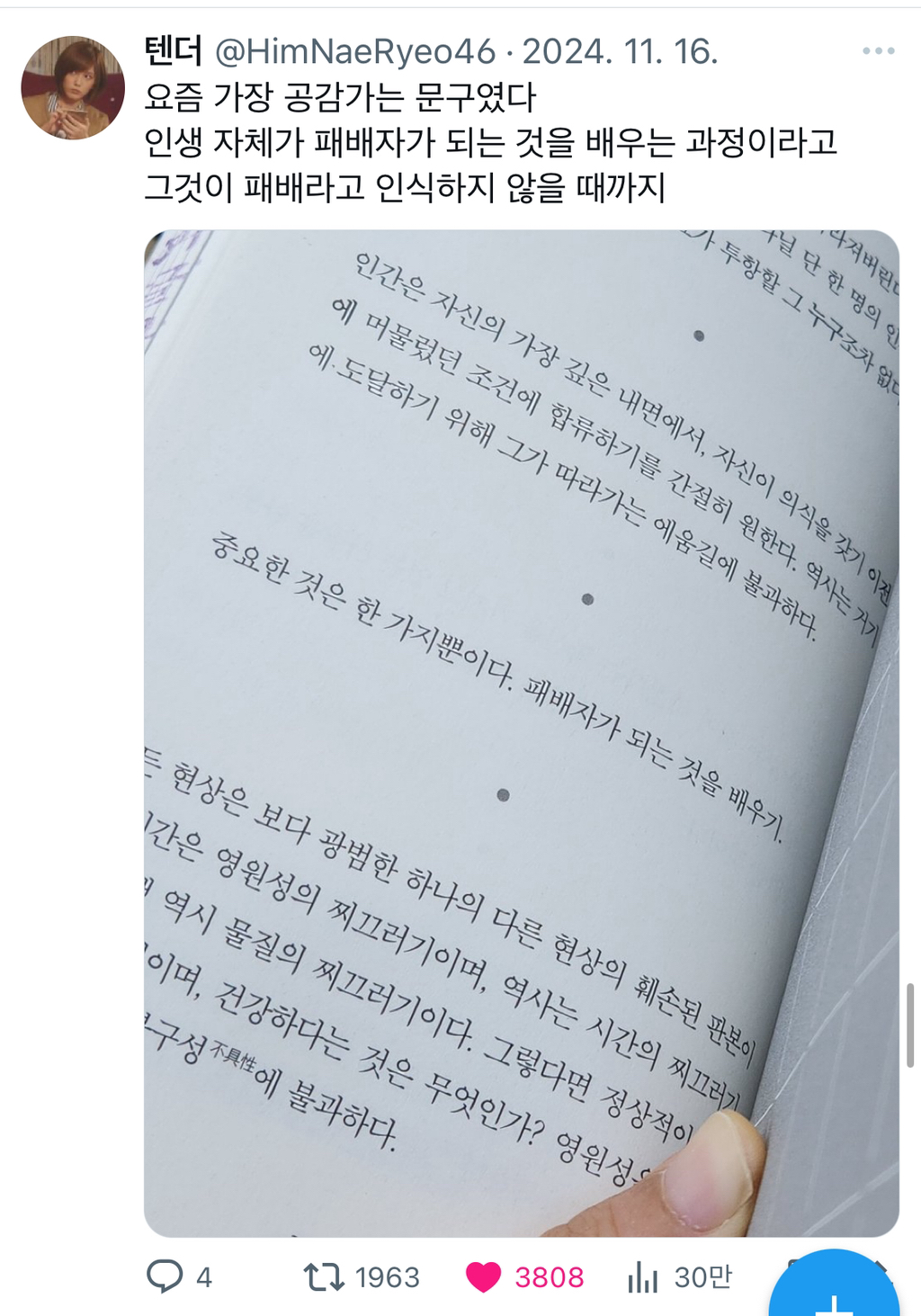 작성자내자신을잃지않기 작성시간 26.01.31 맞아 그리고 내가 특별하지 않다는 걸 알게 되는...