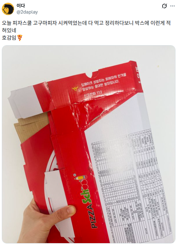 [흥미돋]피자스쿨 붐 업 작성자돼지어터|작성시간26.01.31|조회수42,125 목록 댓글 24 글자크기 작게가 글자크기 크게가 출처: https://x.com/humbllly/status/2017138546784804984 다음검색 현재 게시글 추가 기능 열기 북마크 공유하기 신고 센터로 신고 댓글 댓글 24 댓글쓰기 답글쓰기 댓글 리스트 작성자반박시 님 말이 뛰어다님 | 작성시간 26.01.31 크으 작성자다이룰지니 | 작성시간 26.01.31 명문대 클라스 작성자간지나게 | 작성시간 26.01.31 오 조만간 먹어주겠어 작성자플초주기적으로 | 작성시간 26.01.31 내 모교에요 작성자코라닝 | 작성시간 26.01.31 이미 이번달에 두번이나 먹음 앞으로도 먹겠습니다 댓글 전체보기