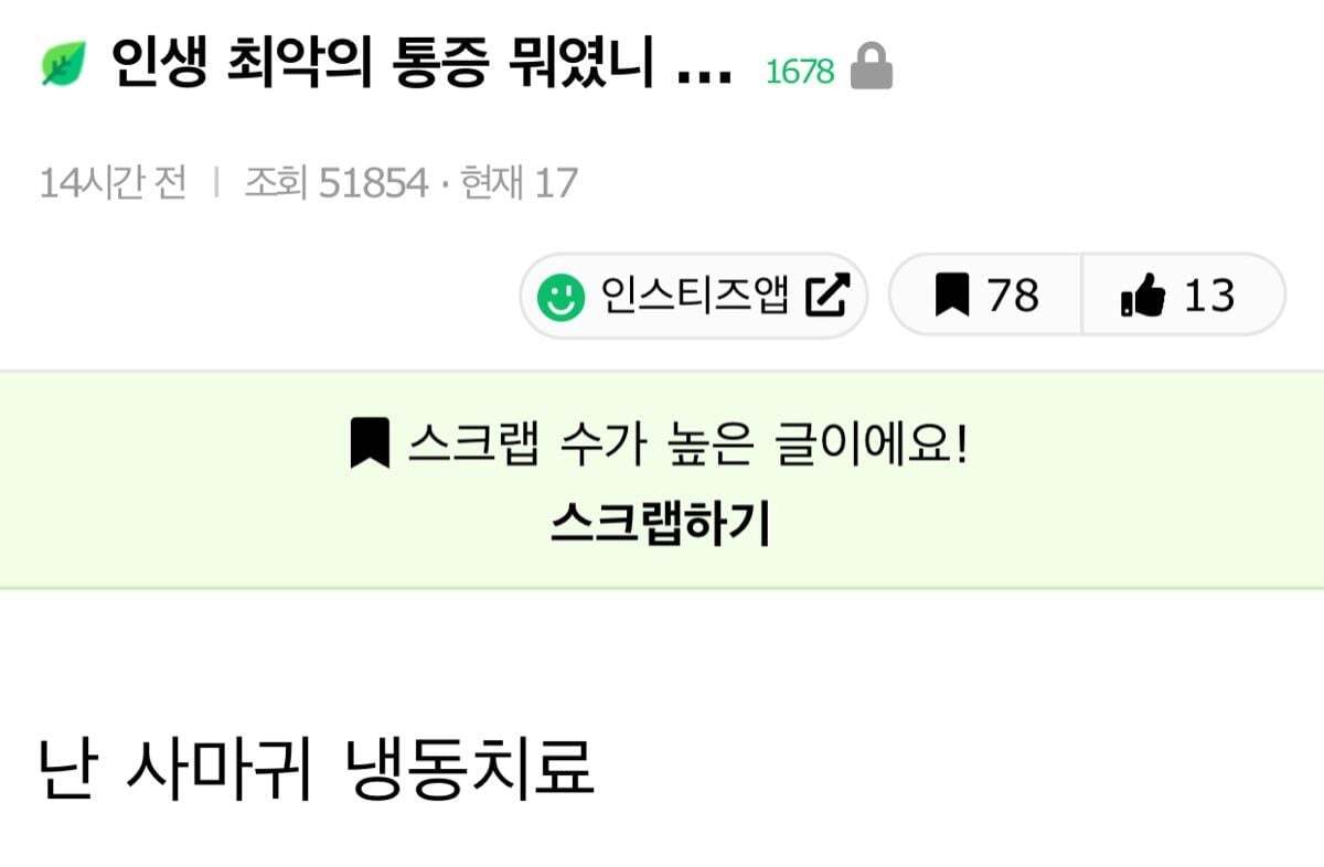[스크랩] [흥미돋]인생 최악의 통증 뭐였니.... 작성자면허증재발급|작성시간26.01.31|조회수65,431 목록 댓글 344 글자크기 작게가 글자크기 크게가 출처 : 여성시대 (본인 닉네임)_ 난 교정기 처음달고 2주 ㅡㅡ 햄버거 물려다가 눈물남 다음검색 스크랩 원문 : *여성시대* 차분한 20대들의 알흠다운 공간 현재 게시글 추가 기능 열기 북마크 공유하기 신고 센터로 신고 댓글 댓글 344 댓글쓰기 답글쓰기 댓글 리스트 작성자R=VD 된다1등로또 | 작성시간 26.02.01 허리근육놀란거 ,근종통 작성자제러드 파달렉키 | 작성시간 26.02.01 1순위 담석증떄문에 간이식직전까지가고 쓸개제거전 너무아플때 2순위 허리디스크터졌을때+방사통 작성자주정뱅이 | 작성시간 26.02.01 노로.. 작성자초코 | 작성시간 26.02.01 바르톨린 낭종... 작성자강냉이파티 | 작성시간 26.02.05 대상포진 댓글 전체보기