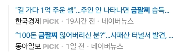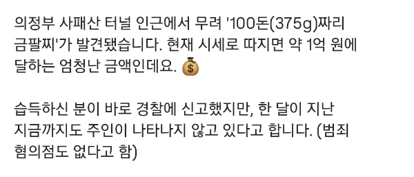 [흥미돋]의정부 터널에서 100돈 금팔찌 잃어버린 사람.jpg 작성자야호우|작성시간26.01.31|조회수111,613 목록 댓글 75 글자크기 작게가 글자크기 크게가 출처: 여성시대 (야호우)내꺼? 같은데 다음검색 현재 게시글 추가 기능 열기 북마크 공유하기 신고 센터로 신고 댓글 댓글 75 댓글쓰기 답글쓰기 댓글 리스트 작성자나기운장난아냐 | 작성시간 26.01.31 난가…어쩐지 손목이 가볍더라니… 작성자생각좀해라 | 작성시간 26.01.31 터널입구 차로에 떨어져있었대 이미지 확대 작성자닉넴바꿀떼가됏다 | 작성시간 26.01.31 대박 작성자수영수영 | 작성시간 26.02.02 누가 훔쳤다가 던진 건가? 뭐지.. 궁금하다 작성자직장인을 석방하라 | 작성시간 26.02.02 색깔 보니까 아무래도 내꺼같아 댓글 전체보기