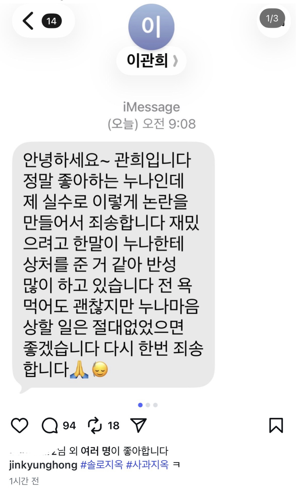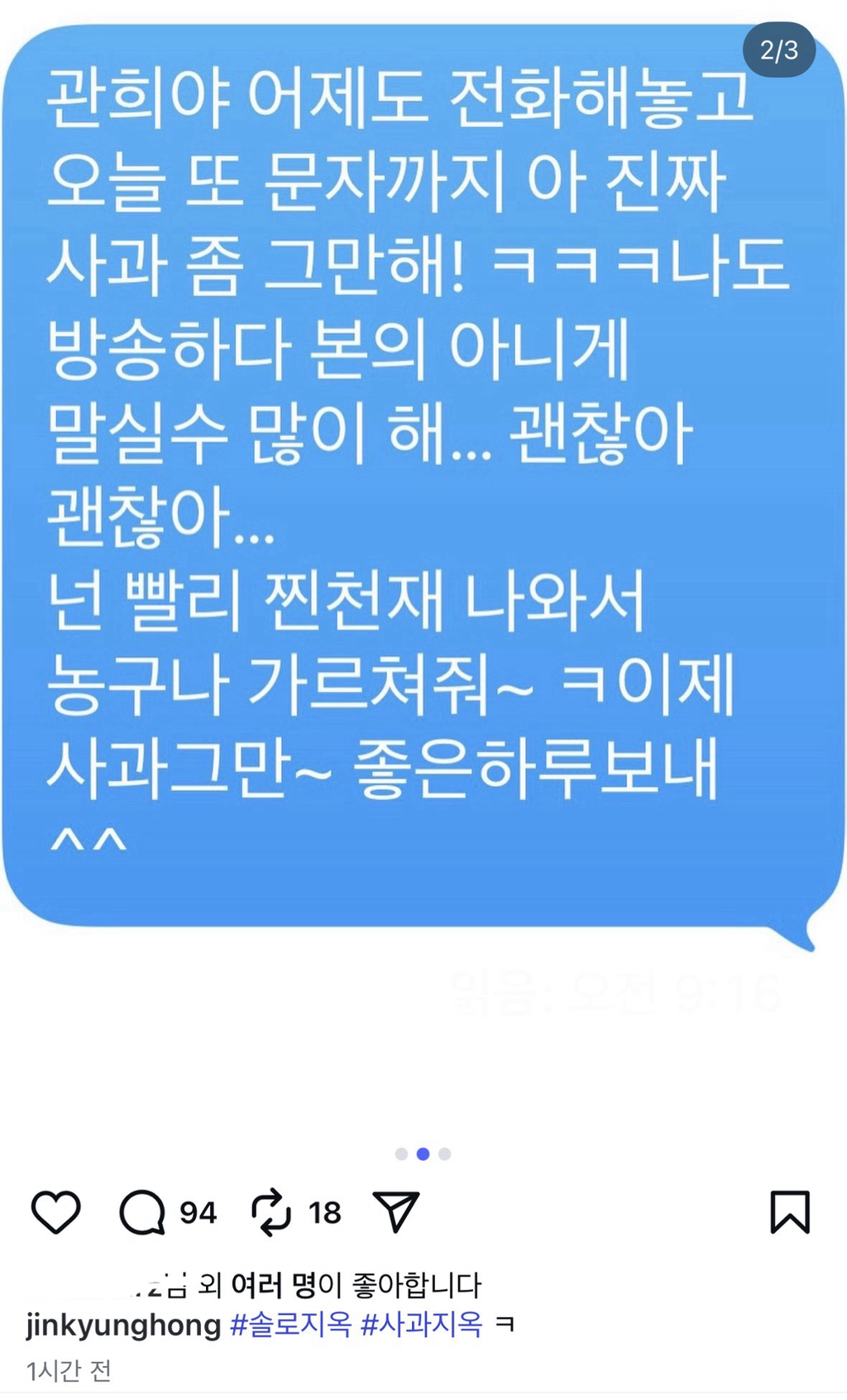 [흥미돋]홍진경 인스타그램.jpg 작성자Hypehype|작성시간26.01.31|조회수176,199 목록 댓글 373 글자크기 작게가 글자크기 크게가 출처: 여성시대 Hypehypehttps://m.cafe.daum.net/subdued20club/ReHf/5563355?svc=cafeapp홍진경 저격한 솔로지옥3 이관희출처: https://www.dmitory.com/issue/398427702https://youtu.be/w-rZS3poWXE?si=G4CK4Ot7H-2-NY4Tm.cafe.daum.net이전 상황은 여기서 확인악플은 참기 다음검색 현재 게시글 추가 기능 열기 북마크 공유하기 신고 센터로 신고 댓글 댓글 373 댓글쓰기 답글쓰기 댓글 리스트 작성자whyranosaurus | 작성시간 26.02.06 욕먹어도 괜찮대 작성자꾸꾸구꾸 | 작성시간 26.02.07 ㅋ.. 작성자쌀알이 | 작성시간 26.02.07 ㅡㅡ? 작성자행운럭키 | 작성시간 26.02.08 이미 마음속에 손절 했을듯 작성자두번째생신 | 작성시간 26.02.09 본인때매 상처까지 받을란가는 몰겠고..... 무례한 모습은 확실하게 비춰지긴함. 댓글 전체보기